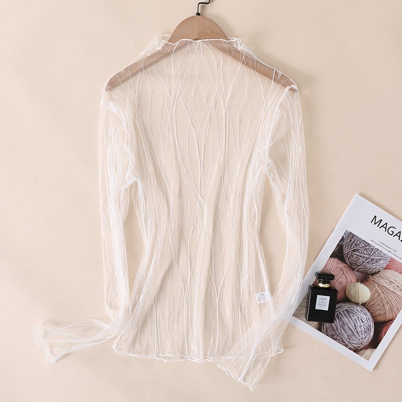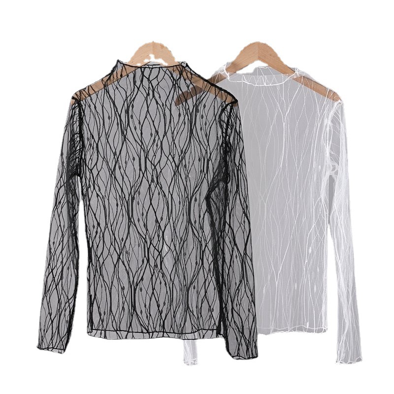 Black Lace Base Shirt Women's Long-sleeved Spring and Autumn Western Style Tulle High Collar Inner Shirt Transparent Sexy Mesh Top