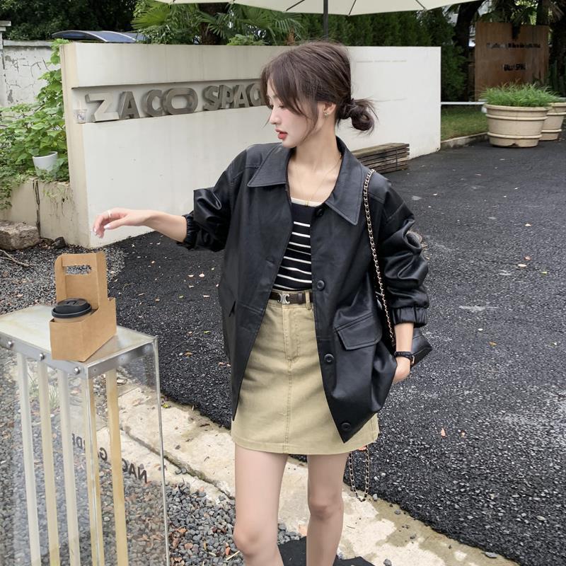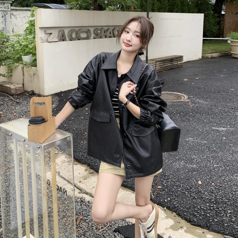 Black leather coat for women autumn 2024 New Hong Kong style retro motorcycle clothing loose PU leather jacket alienation wear