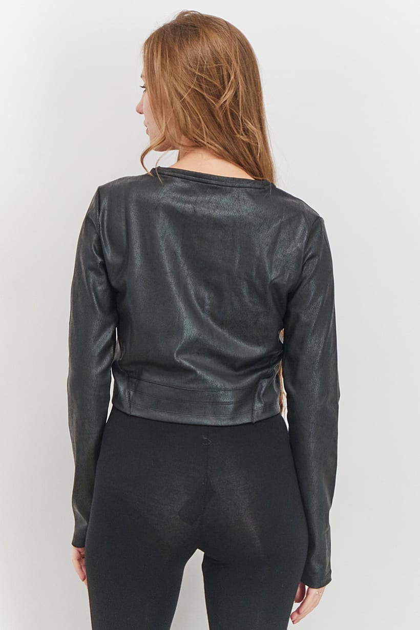 Black Leather Long Sleeve Crew Neck Top for Women.
