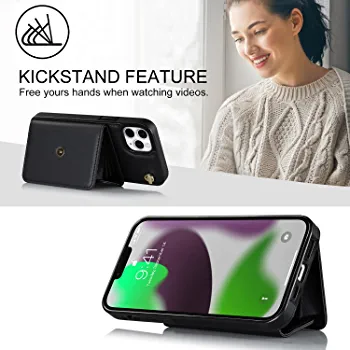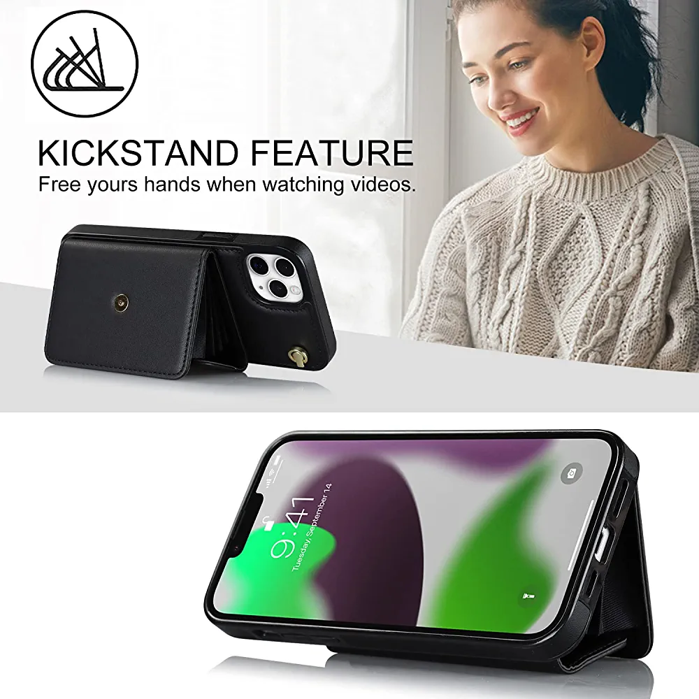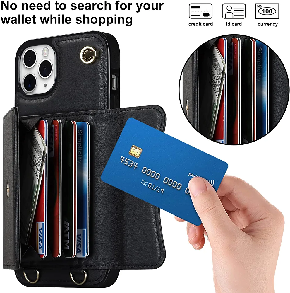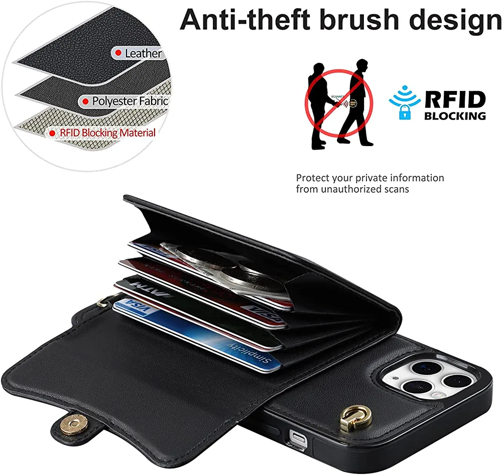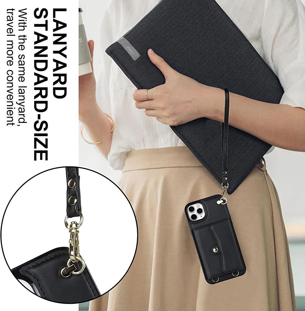 Black leather phone case for iPhone 11 Pro Max with RFID blocking credit card holder, wrist crossbody strap, and lanyard.