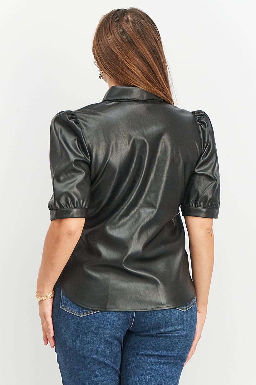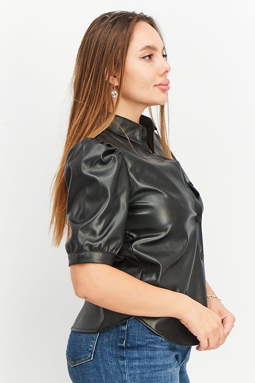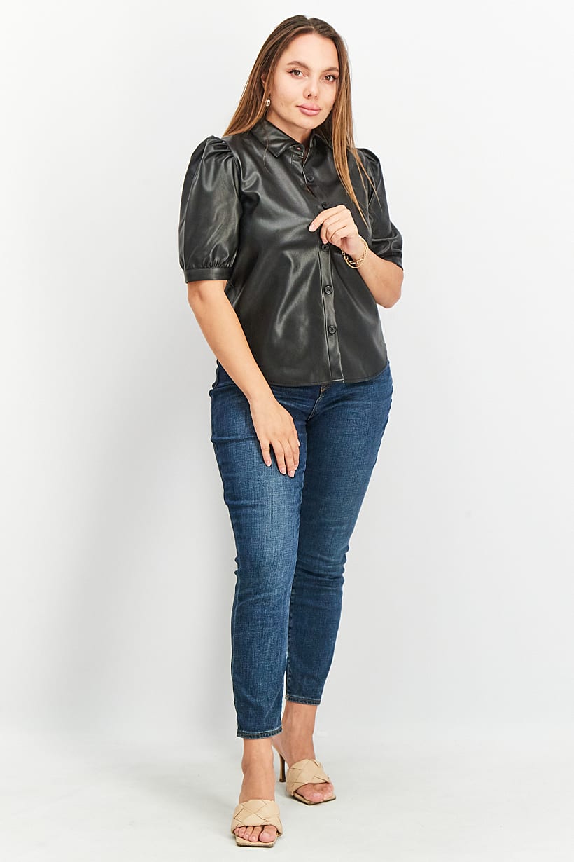 | nameOriginal | Women Spread Collar Puff Sleeve Button Down Detail Leather Tops, Black |