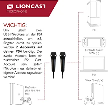 | nameOriginal | Lioncast Pair Of Universal USB Microphones Compatible with Computer and Karaoke Gaming; Compatible with Wii, PS5/Playstation 5, PS4 & PC Games as SingStar, Lets Sing, We Sing; 3m cable – Black |