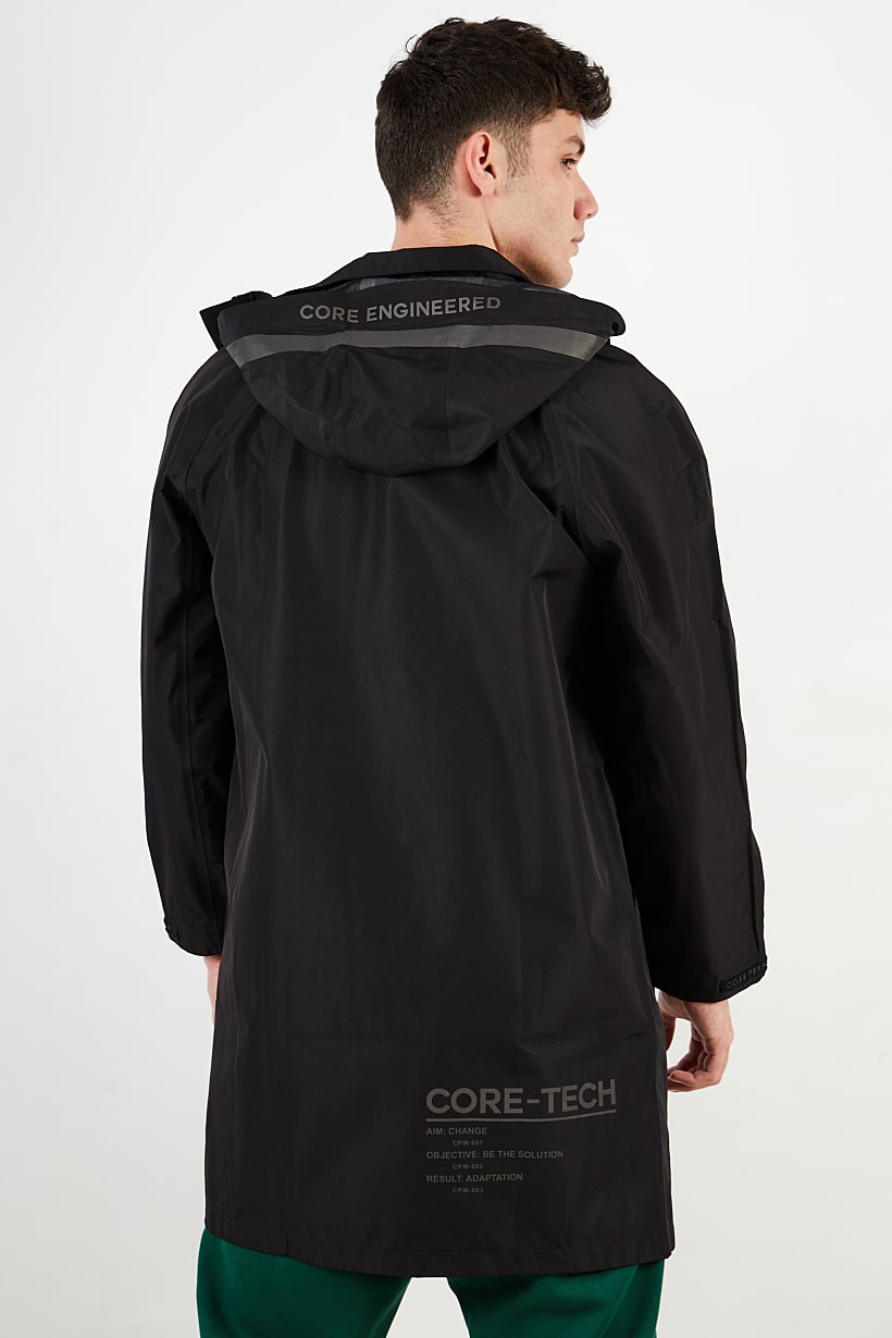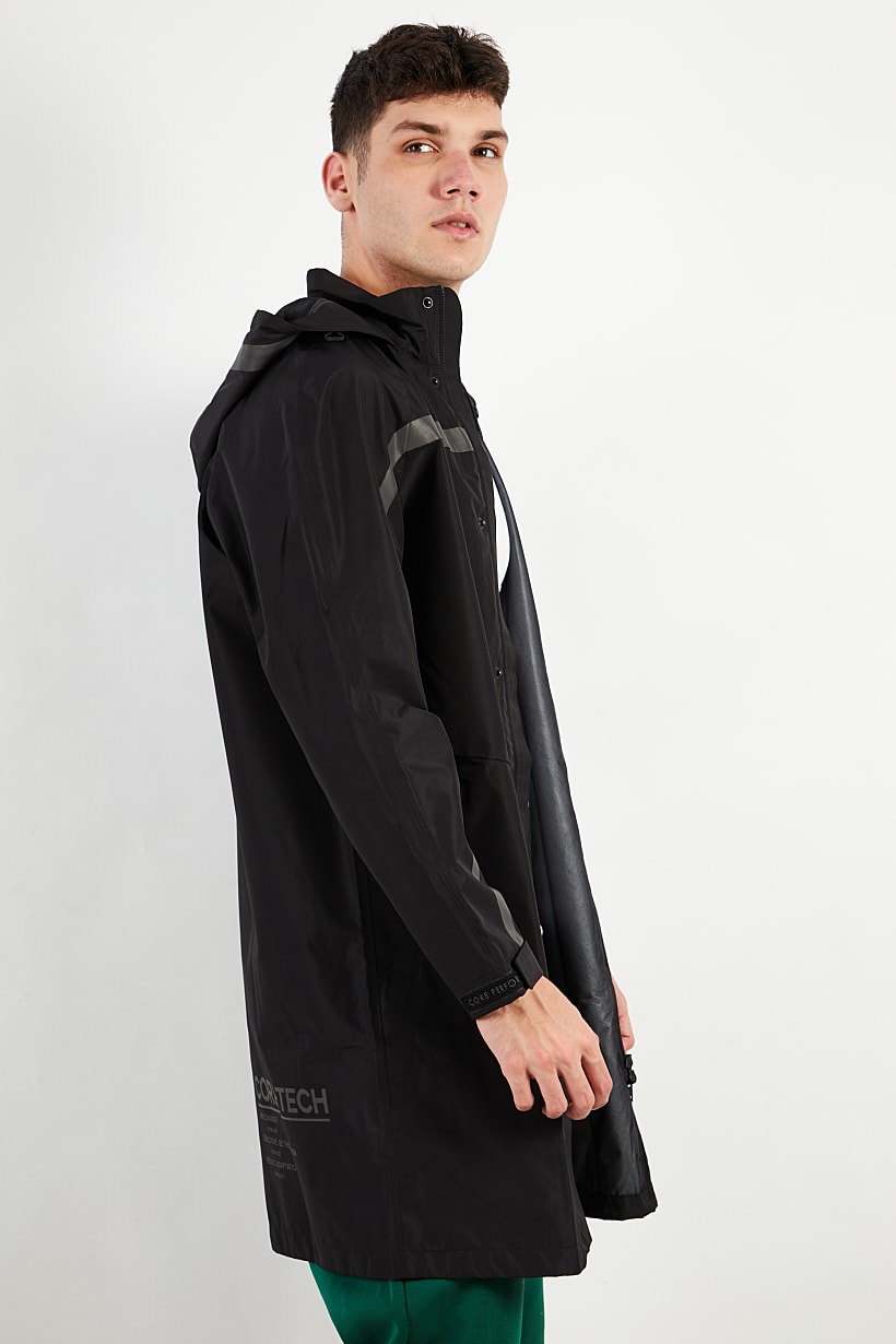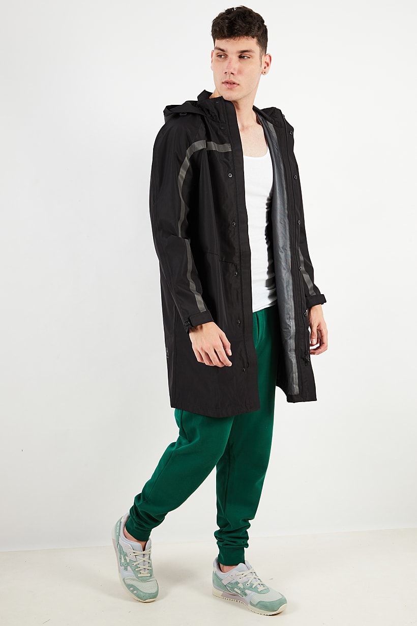 This sportswear jacket is designed for outdoor activities and has a sportswear fit. It is made of 100% polyester fabric and has a light thickness. The color family is black and the pattern is plain/solid. The care instructions recommend hand washing. The size shown is international.