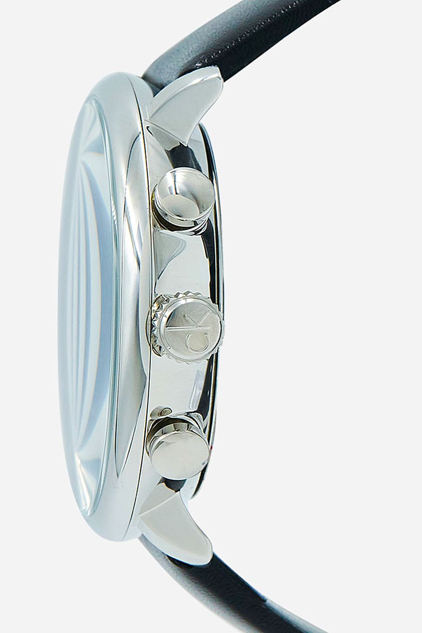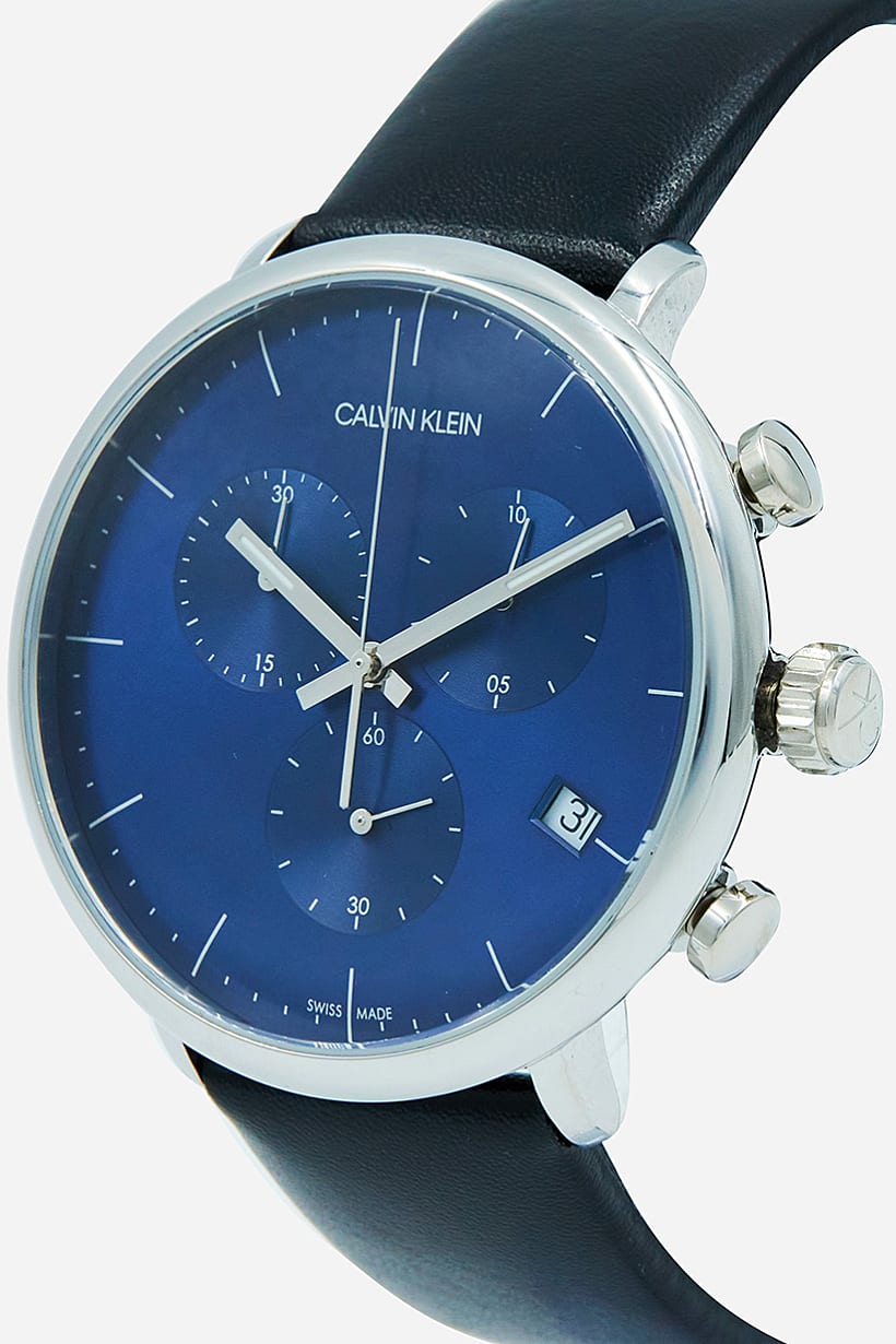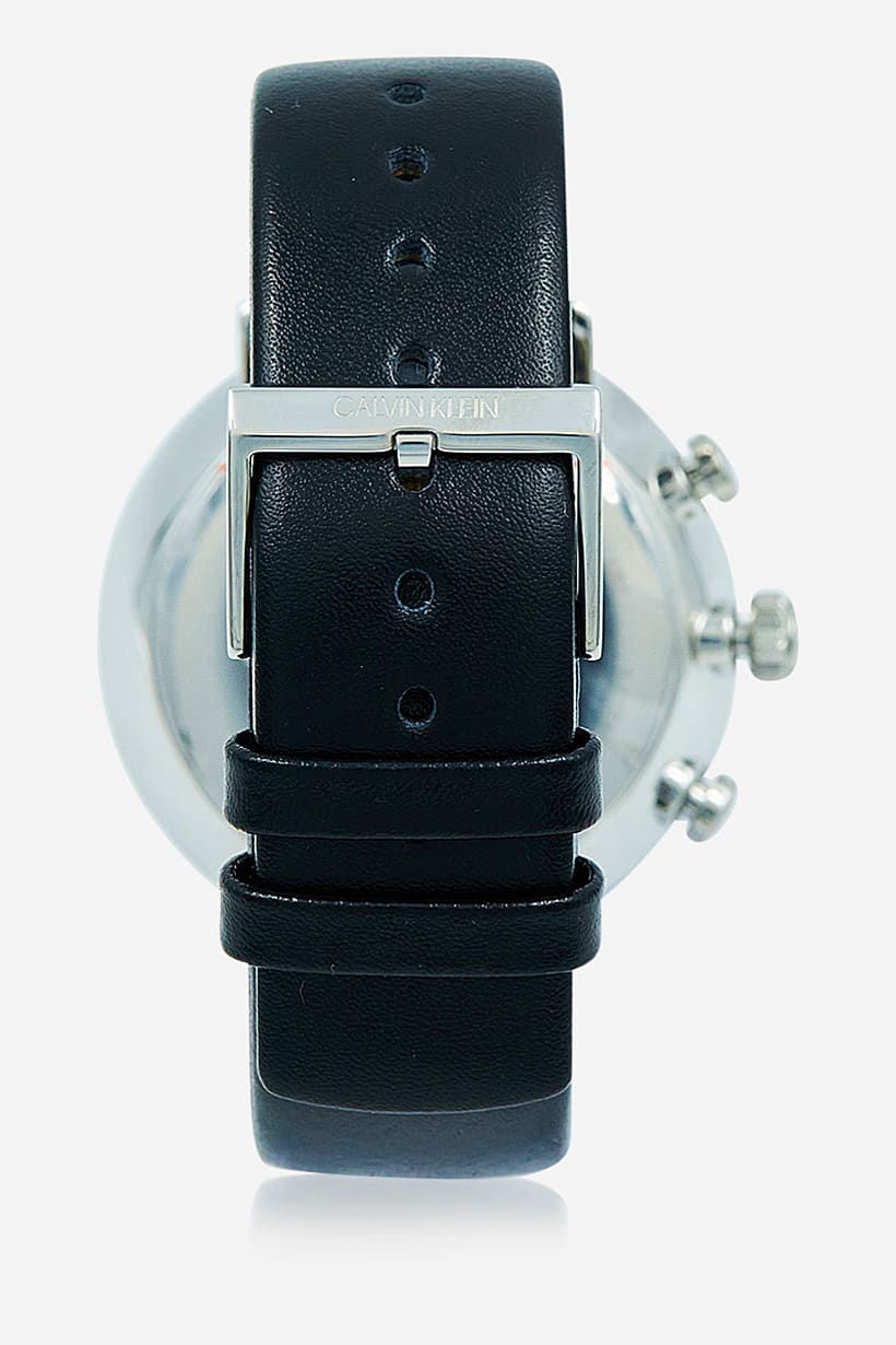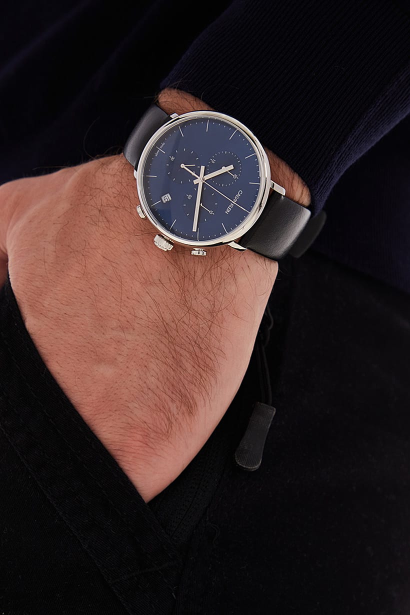 This product is an analog watch with a black leather strap and buckle closure. The dial color is blue and the markers are easily visible. It is an ideal gift for men and is water-resistant. The color family is black, making it a versatile accessory for any outfit.