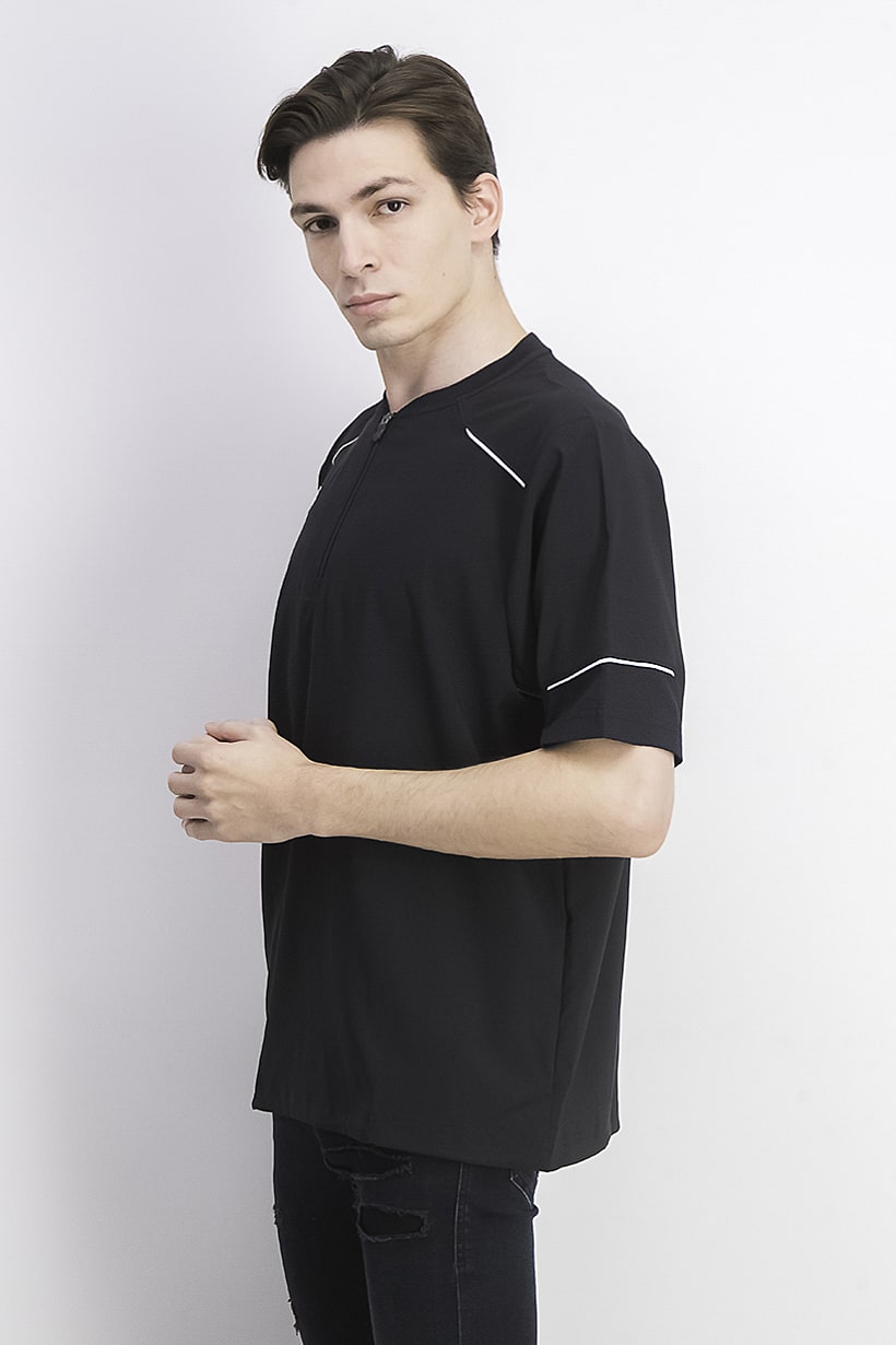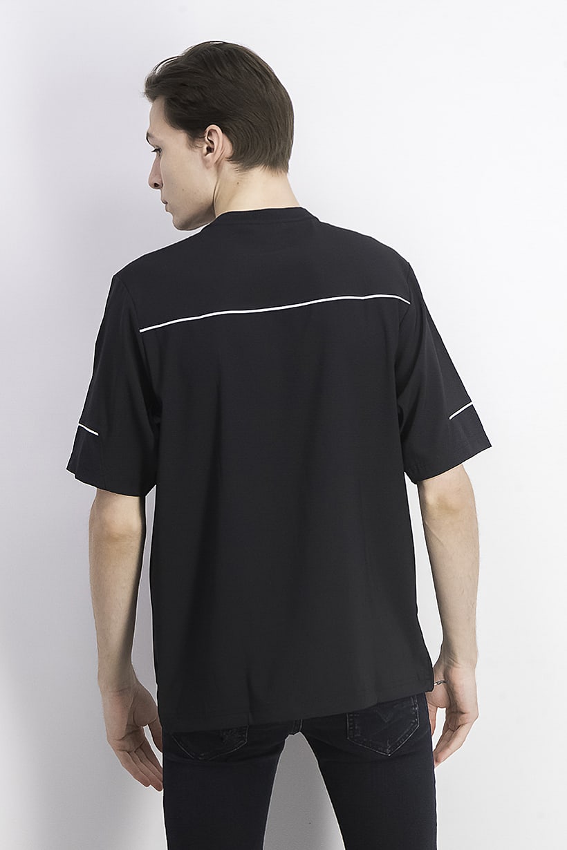 This t-shirt is designed for sports enthusiasts with a regular fit and a light thickness. It features a band collar and is made of a blend of 7% elastane and 93% polyester fabrics, making it comfortable and machine washable. The embroidered pattern adds a touch of style to the black color, which may appear slightly different due to lighting or monitor settings. This t-shirt is suitable for training and other sportswear occasions. The size shown is international.