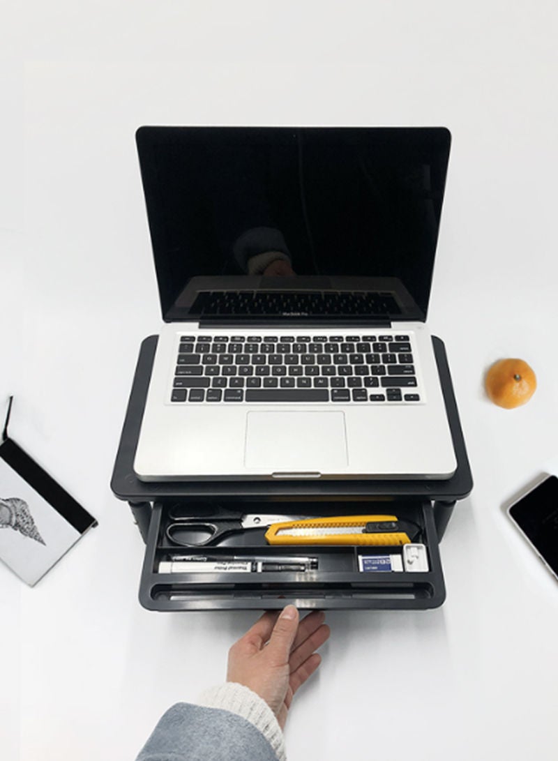 The stand also features a convenient storage drawer that provides ample space for storing office supplies, documents, or other small items, keeping your workspace organized and clutter-free. The drawer is easy to open and close, and its smooth gliding mechanism ensures that it operates quietly and smoothly.
