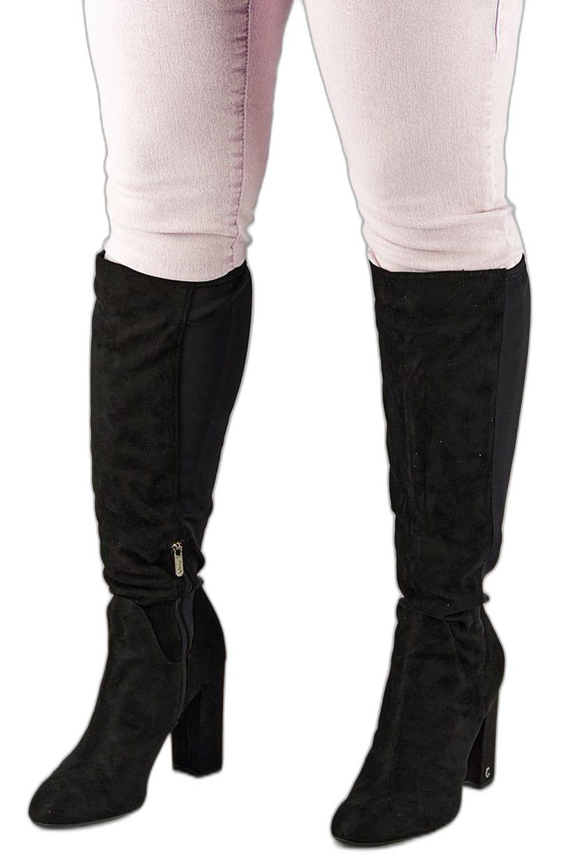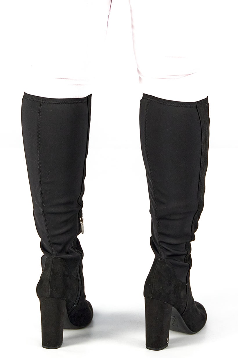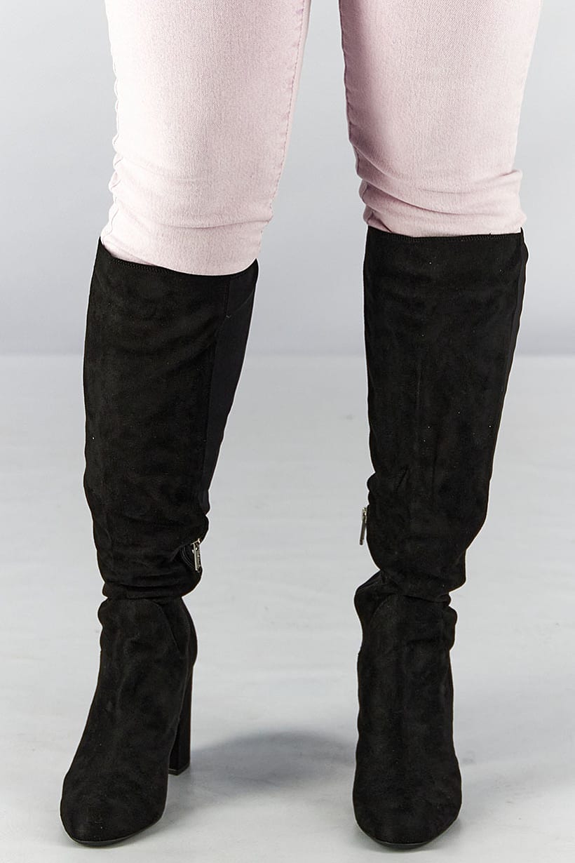 Heel Height : 4.5" / 11.4 cm, Heel Style : Block heel, Ideal For : Women, Shoe Closure : Zipper closure, Shoe Width : Medium, Sole Material : Synthetic sole, Style : Mid Calf Boot, Toe Style : Closed toe, Occasion : Casual, Shoe Material : Suede , Color Family : Black,
