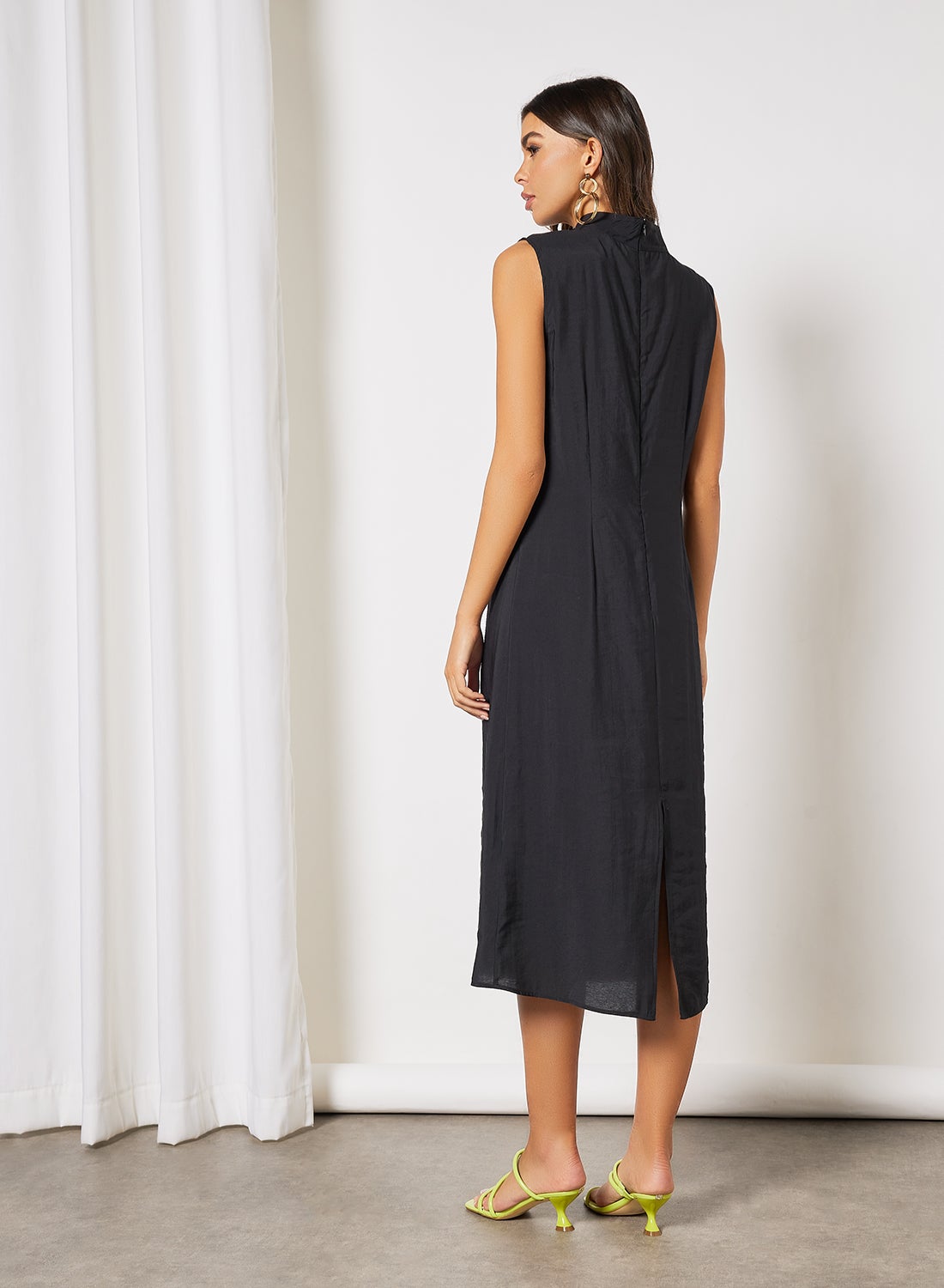 This dress is a must-have with its uncomplicated and fundamental design. It features a high neckline and is sleeveless, making it versatile for various occasions. The dress is made of 86% Modal and 14% Polyester, ensuring comfort and durability. To maintain its quality, kindly follow the care label instructions when washing.