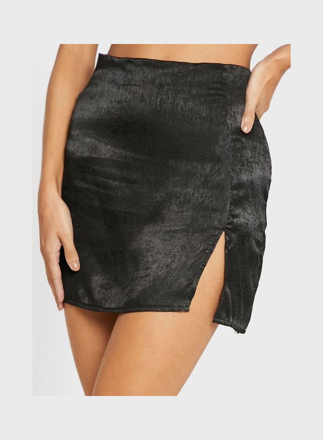 Introducing a modern take on the timeless mini skirt with our latest design. Crafted from luxurious polyester fabric with a smooth satin finish, this skirt offers both comfort and style. It features a discreet side zipper closure and a chic single side slit at the hem. Please note that each item is sold separately.