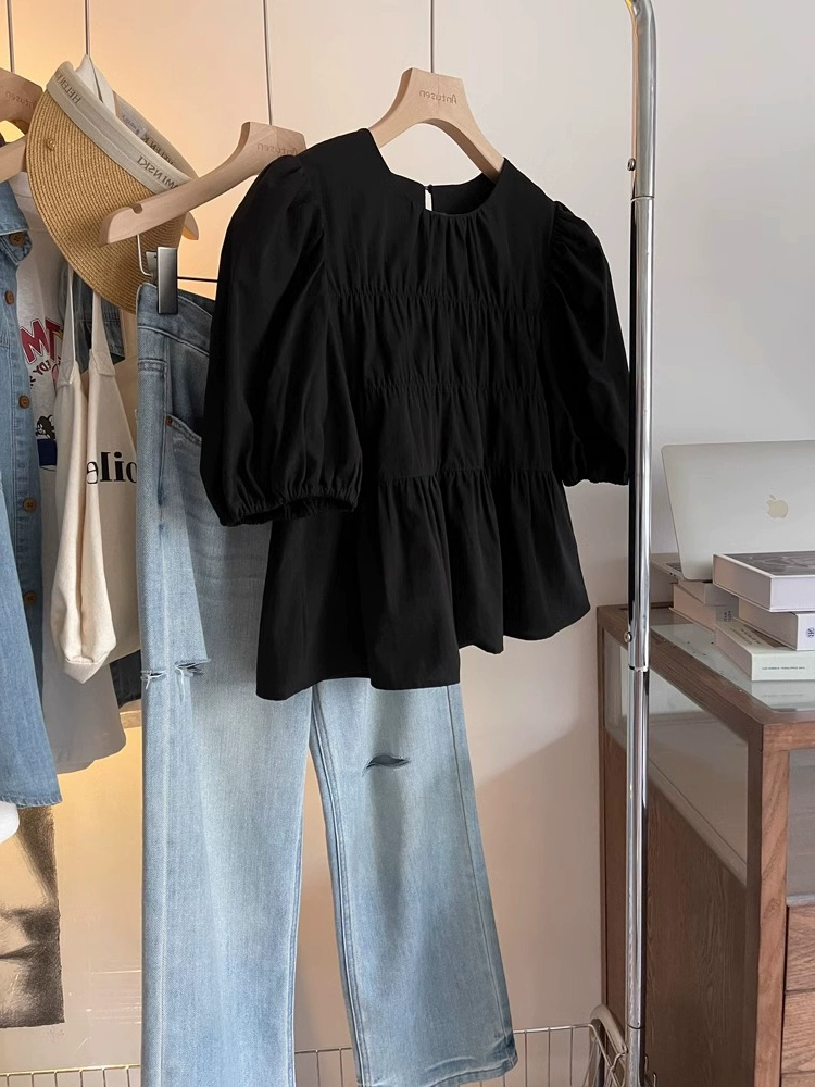 | nameOriginal | Black niche pleated round neck women's summer top shirt |