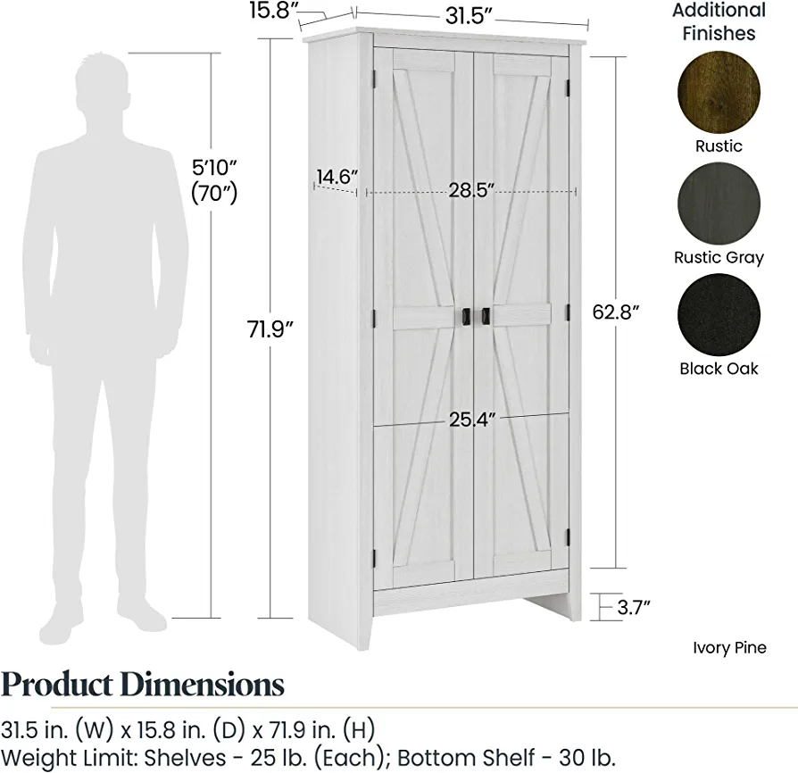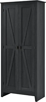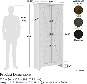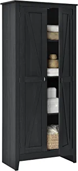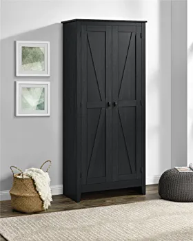 Stay organized in style with the SystemBuild Farmington Storage Cabinet. Its rustic barn design and tapered feet give it a weathered look, but it’s made of sturdy laminated particleboard and MDF to hold all your home office supplies, linens, clothing, and nonperishable food. The two doors open to reveal four spacious shelves, two of which are adjustable to accommodate items of different sizes. The weathered black woodgrain finish adds a rustic touch to your space. Assembly and moving require two adults, and a wall anchor kit is included for added safety. Once assembled, the cabinet measures 71.9”H x 31.5”W x 15.8”D.