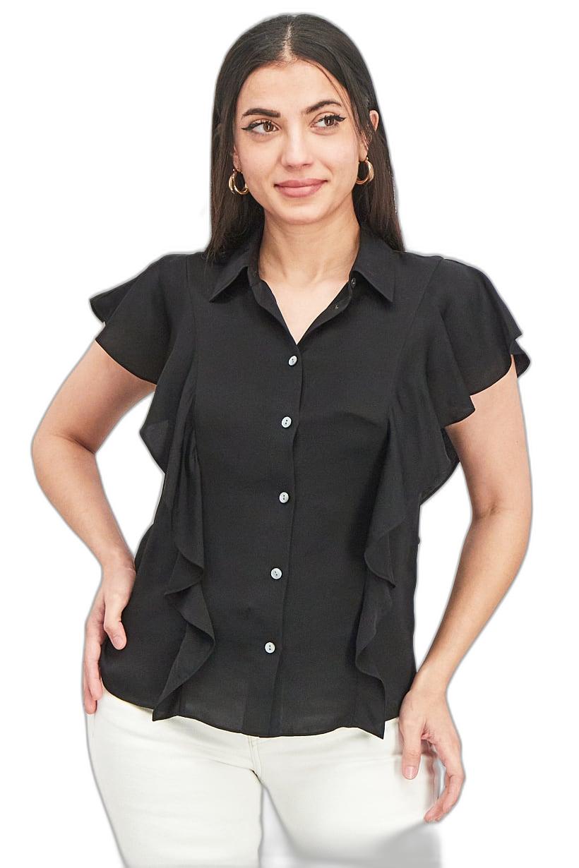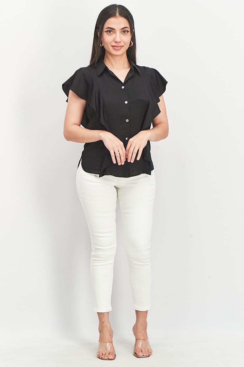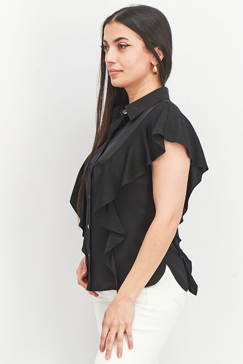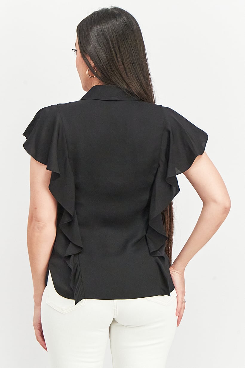 | sub_Categories | Women Clothing, Tops & Tees, women petite spread collar flutter sleeve plain blouse black |