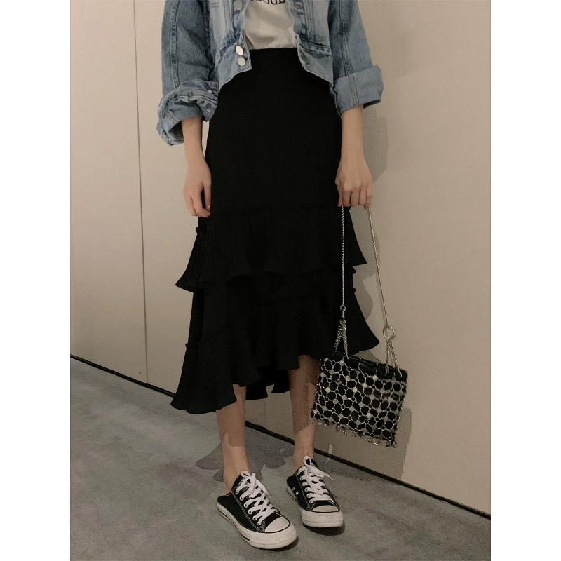 | nameOriginal | Black pleated short draped mid-length cake skirt |