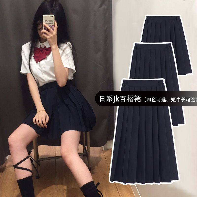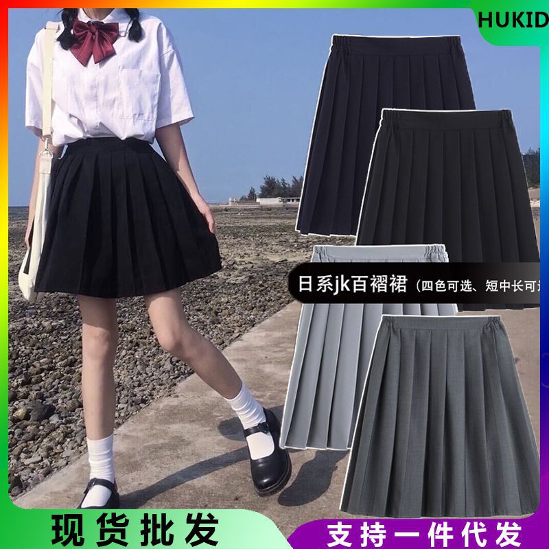 Black pleated skirt women's summer jk uniform gray high waist mid-length elastic waist plus size skirt long skirt