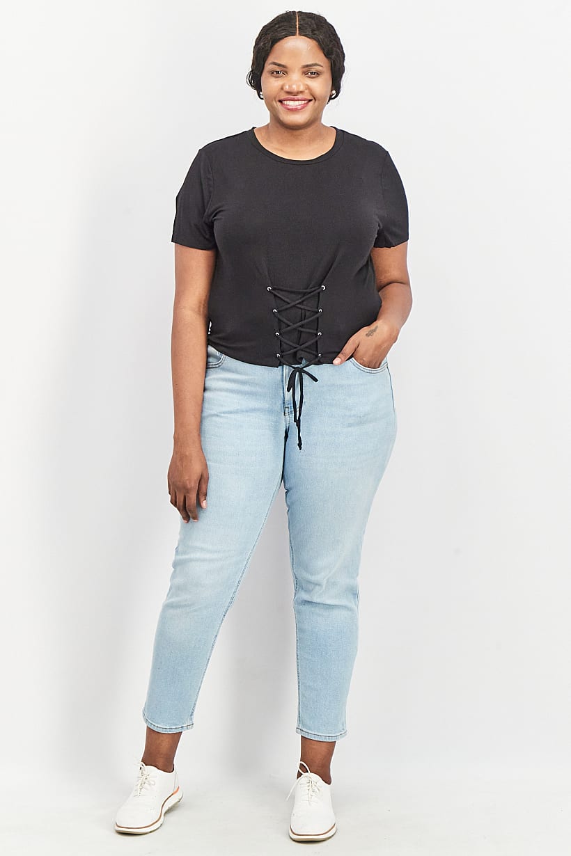 Women Clothing, Tops & Tees, women plus size crew neck short sleeves crisscross blouse black