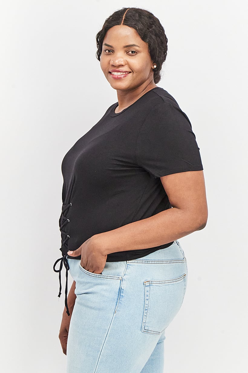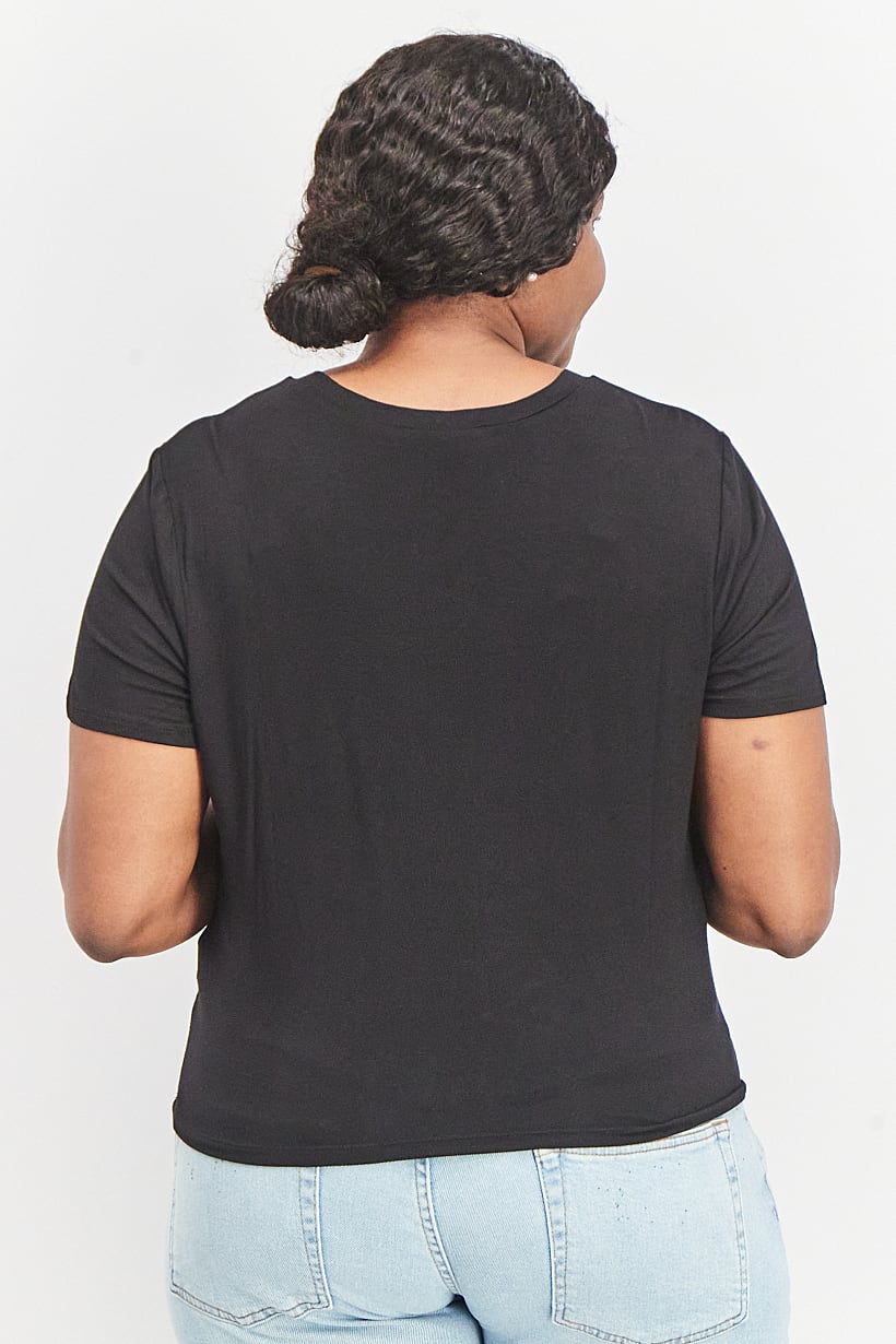 Care : Machine washable, Fit : Plus Size, Ideal For : Women, Size shown : US, Top Style : Blouse, Types of Hem : Straight hem, Types of Neckline & Collar : Crew neckline, Types of Sleeve : Short sleeve, Disclaimer : Product color may slightly vary due to photographic lighting sources or your monitor settings., Fabrics : 94% Rayon, 6% Spandex, Occasion : Casual, Pattern & Print : Plain/Solid, Types of Closures : Pullover, Color Family : Black,