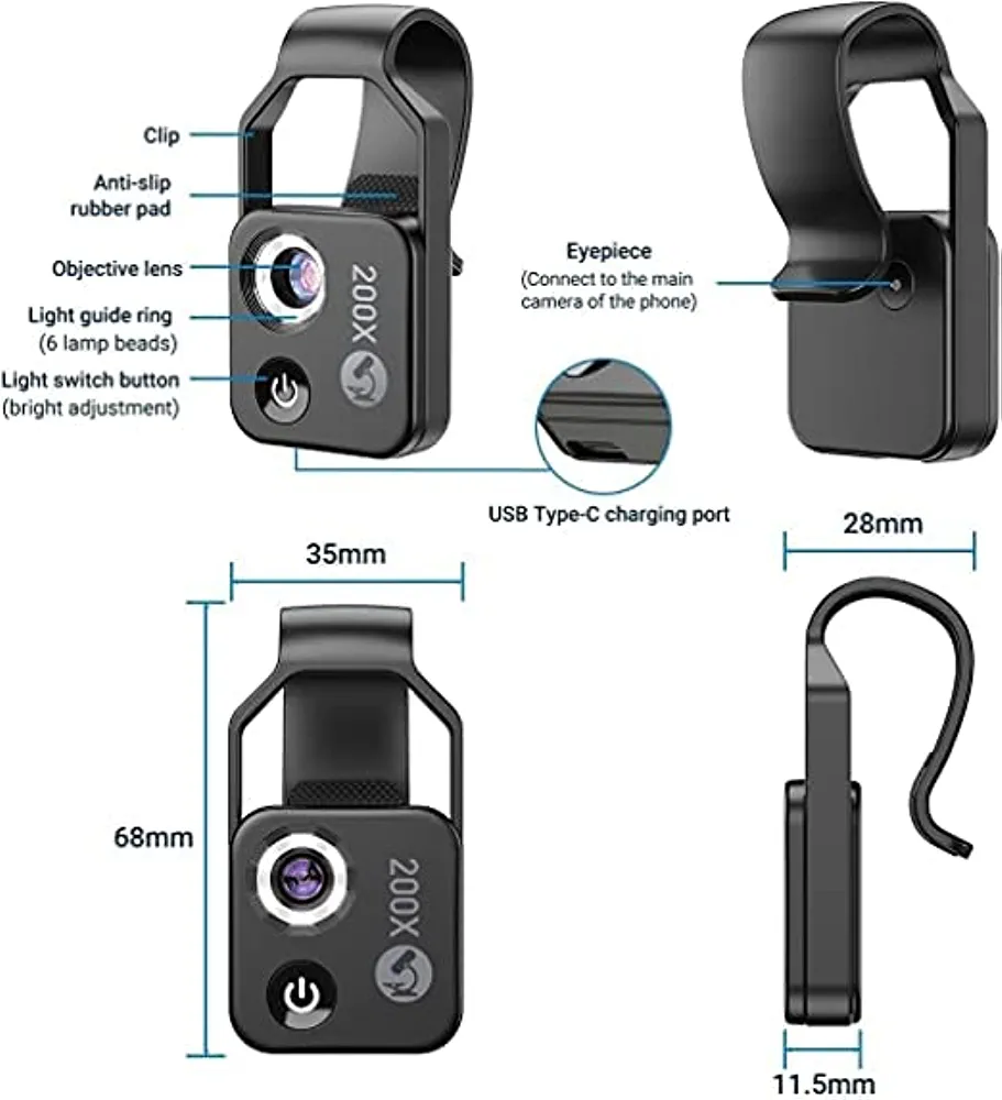 Introducing the Portable Phone Microscope Attachment, a must-have gadget for both adults and kids. With its easy-to-use clip-on feature, you can explore the micro world anywhere and anytime without the need to install any app. This external microscope lens offers a 200 times magnification on your phone or tablet, making it perfect for capturing the tiniest details of any subject.