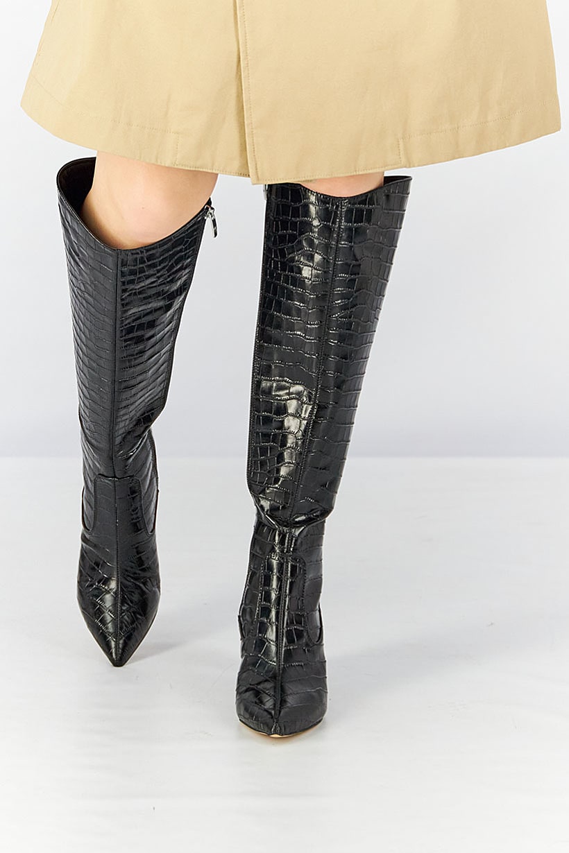 Heel Height : 3" / 7.6 cm, Heel Style : Block heel, Ideal For : Women, Shoe Closure : Zipper closure, Shoe Width : Medium, Sole Material : Synthetic sole, Style : Knee-length boot, Toe Style : Pointed toe, Disclaimer : Product color may slightly vary due to photographic lighting sources or your monitor settings., Occasion : Casual, Pattern & Print : Textured pattern, Shoe Material : Synthetic Leather, Color Family : Black,