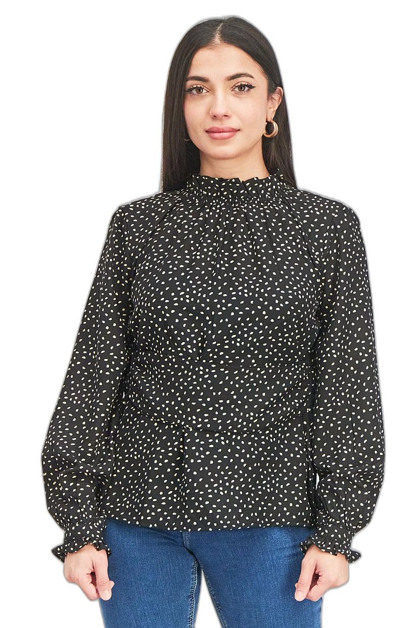This blouse is designed for easy care as it is machine washable. It has a regular fit and is available in international sizes. The top features a straight hem and a ruffle collar neckline with long sleeves. The polka dot pattern adds a playful touch to this casual blouse. It is made of 100% polyester fabric and has a pullover closure. Please note that the product color may vary slightly due to photographic lighting or monitor settings. The color family of this blouse is black.