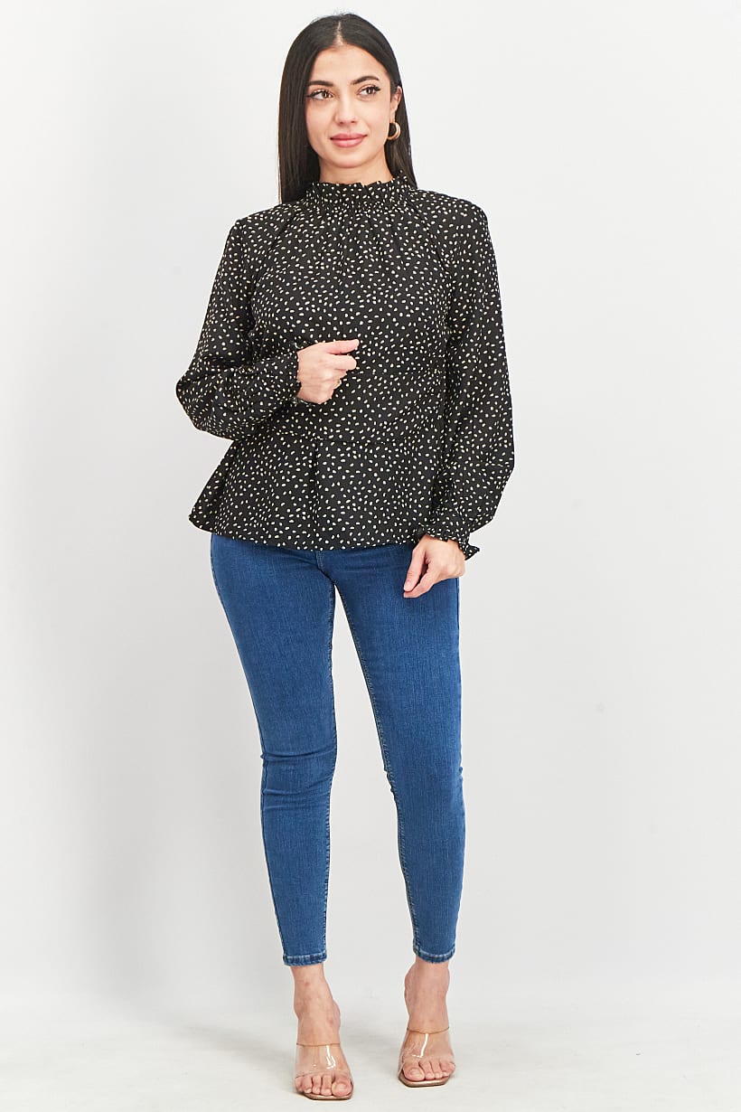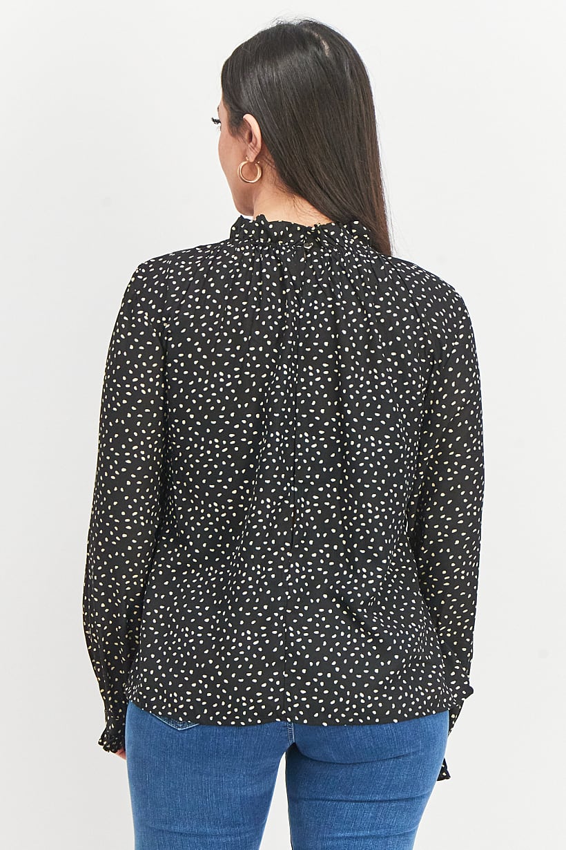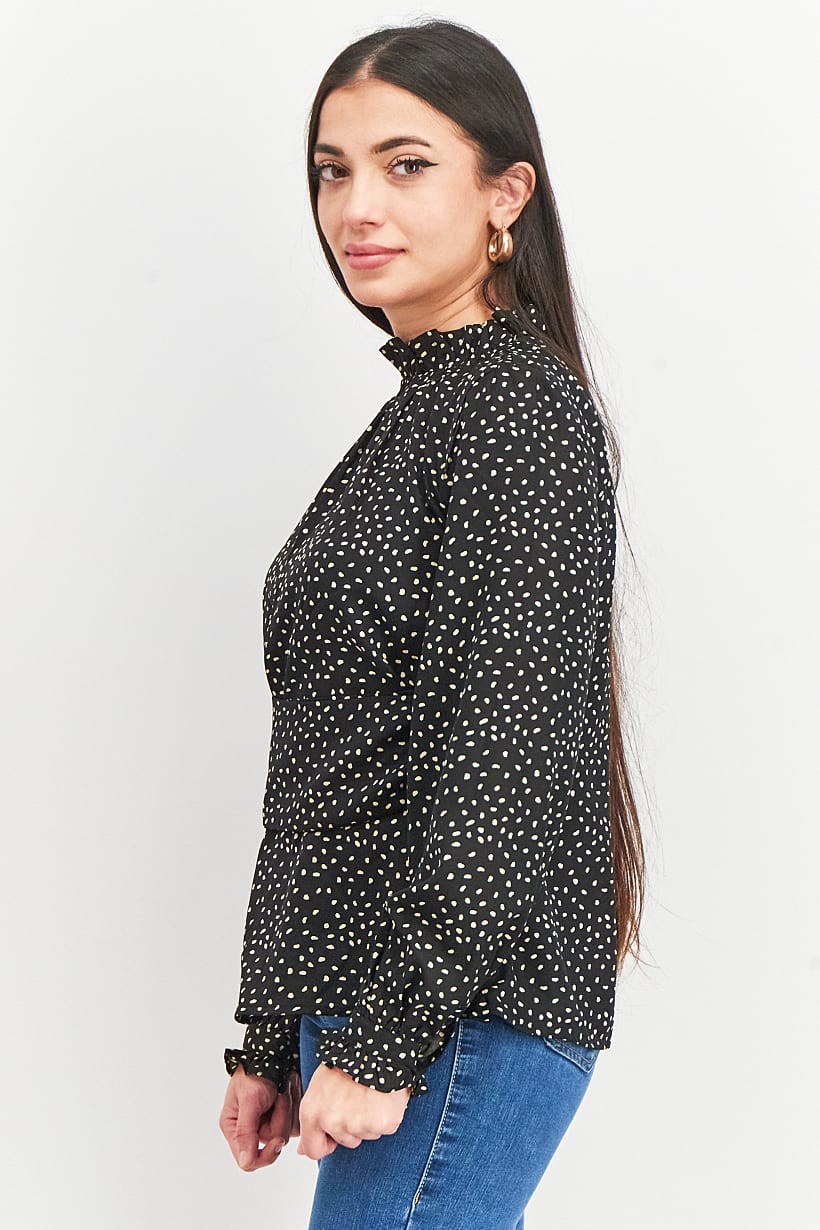 | nameOriginal | Women Ruffle Neck Long Sleeve Open Back Polka Dot Print Top, Black |