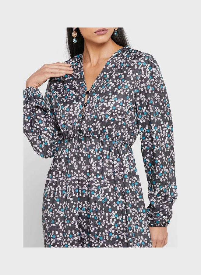 This product boasts a fabric that is both soft and comfortable to wear. It features a striking contrast floral print that covers the entire garment. The V-neck and long sleeves add a touch of elegance to the design. The button up placket ensures a secure fit, while the elasticated waistband provides added comfort.