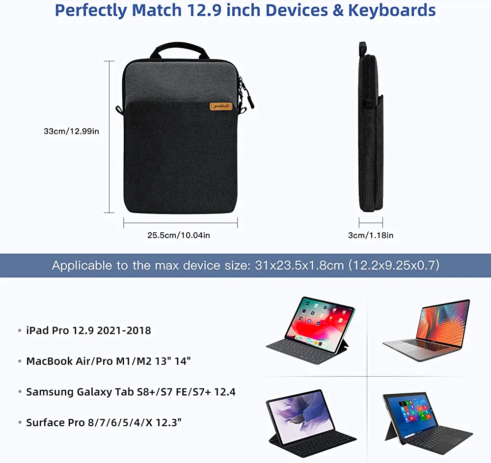 | descriptionOriginal | 【Capacity】-The sleeve bag is designe for all iPad Pro 12.9 / 12-Inch New with Retina Display, Microsoft Surface Pro X, Surface Laptop Go 12.4", Surface Pro7/ 6/ 5 / 4 / 3 / Surface Pro LTE 12.3 inch, Samsung Galaxy Tab S8 Plus 12.4 2022 / Tab S7 FE 12.4 2021 / Tab S7+ 12.4 2020, MacBook Pro 13 inch 2016-2020 / MacBook Air 13.3 inch 2018-2020 / MacBook Air, Pro 13.3 inch with M1 Chip 2020, Huawei MateBook 12", etc |