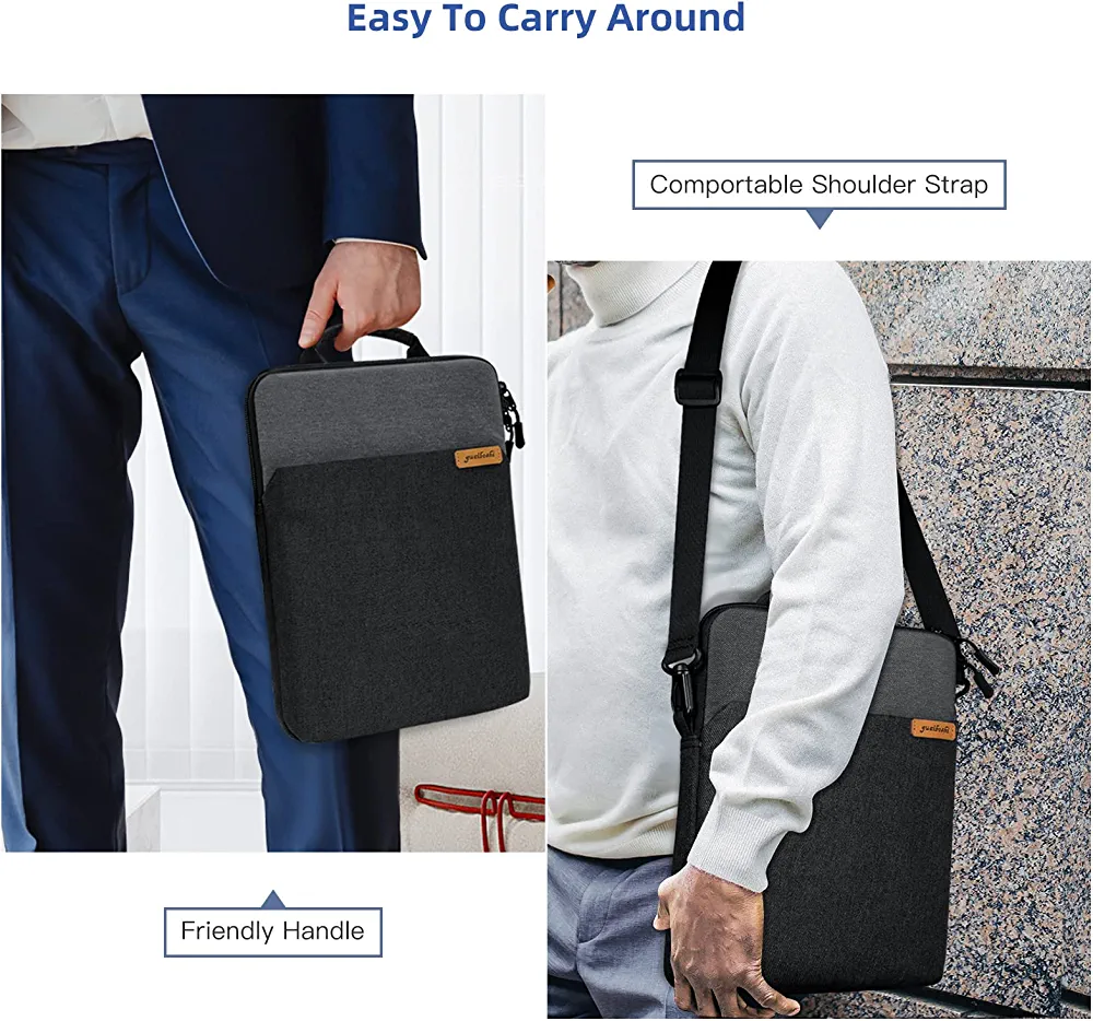 This sleeve bag is suitable for a variety of devices, including iPad Pro, Microsoft Surface Pro, Samsung Galaxy Tab, MacBook Pro and Huawei MateBook. It features multiple compartments, including a main compartment, front zippered compartment, back compartment and two open mesh pockets, providing ample space for accessories. The bag is made of high-quality polyester and has a soft inner lining and thick sponge padding to protect your device from scratches and shocks. It is designed for portability, with an adjustable shoulder strap and comfortable handle, making it perfect for on-the-go use, business or travel. The bag has external dimensions of 12.99”x10.04”x1.18” (33×25.5x3cm) and internal dimensions of 12.4”x9.25”x0.8” (31.5×23.5x2cm), making it easy to carry in your bag. Please ensure to measure the dimensions of your device before purchasing.