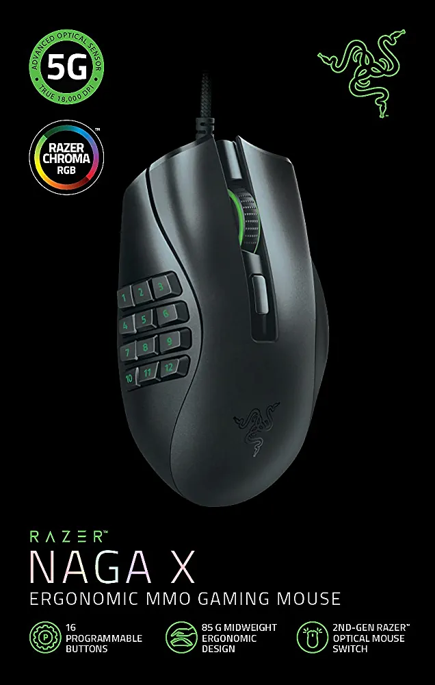 The Razer Naga X is the perfect tool for MMO gamers who want to be ready to raid at all times. With 16 programmable buttons, this ergonomic gaming mouse is designed to be lightweight and packed with features that will help you top the logs.