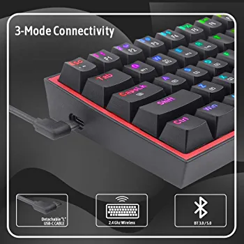 The ultra-compact design and detachable cable make it easy to travel with and provides more room for mousing. The non-slip feet keep the keyboard firmly in place during intense gaming sessions, and the two-level adjustable angle allows for a comfortable position. The free-define software allows for endless typing and backlighting options, giving you a unique user experience. Get ready to be the show-maker with the Redragon K617 Fizz 60% RGB Keyboard.
