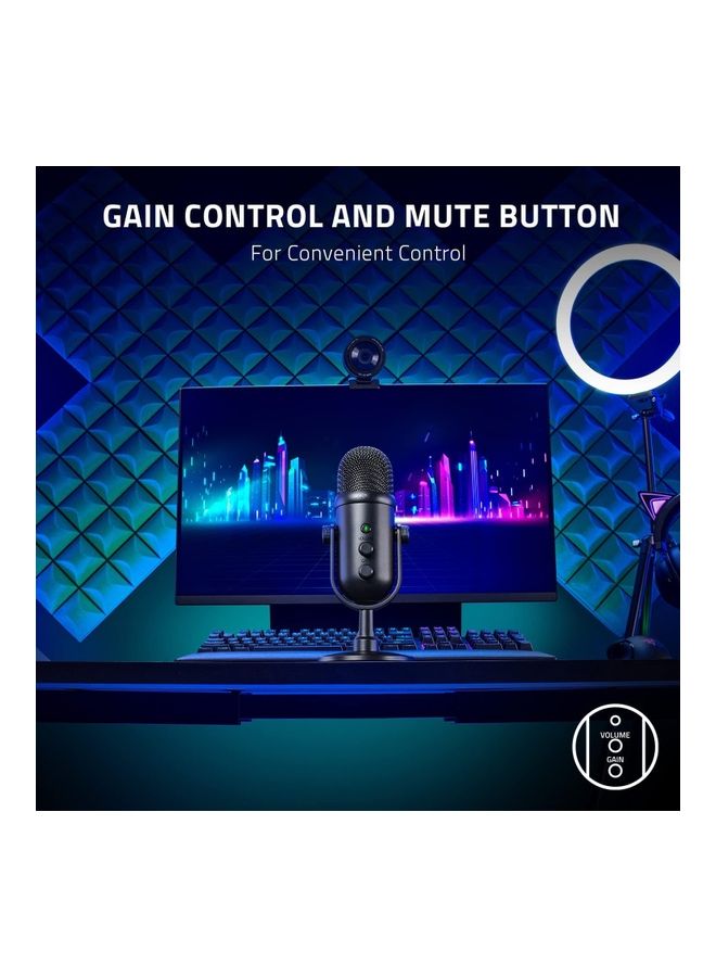 The Seiren V2 Pro is a top-of-the-line USB microphone designed specifically for streamers and content creators. With its sleek black finish and professional-grade construction, this microphone is the perfect addition to any setup. The Seiren V2 Pro features advanced audio processing technology that delivers crystal-clear sound quality, making it ideal for streaming, podcasting, and voiceovers. Its built-in shock mount and pop filter help to reduce unwanted noise and distortion, ensuring that your voice comes through loud and clear. The Seiren V2 Pro is easy to set up and use, with plug-and-play compatibility and intuitive controls. Whether you’re a seasoned pro or just starting out, the Seiren V2 Pro is the perfect tool to take your content to the next level.