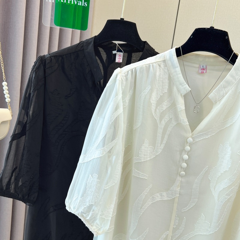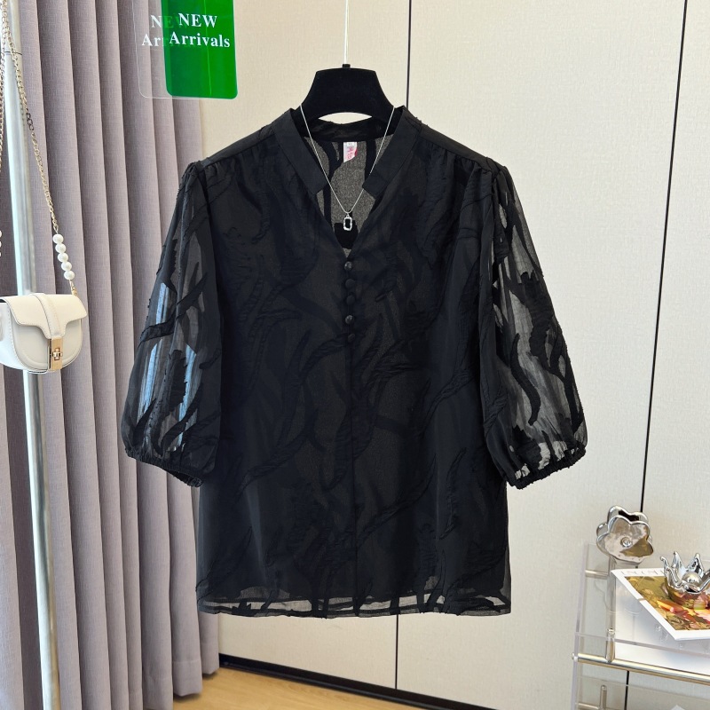 | nameOriginal | Black Short-sleeved Chiffon Shirt Women's 2024 Summer New Fashion Stylish Lace Shirt Loose Belly Covering Top |