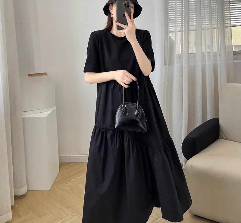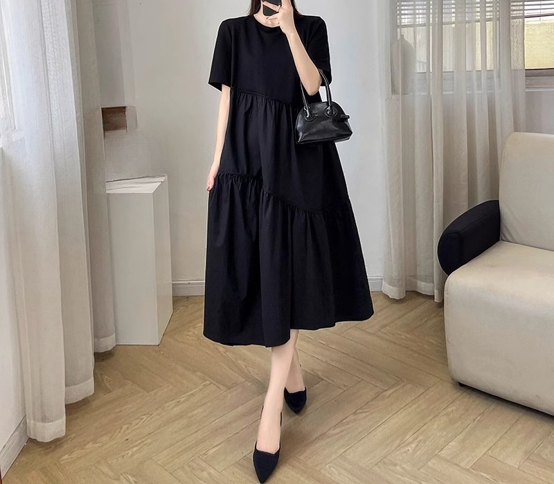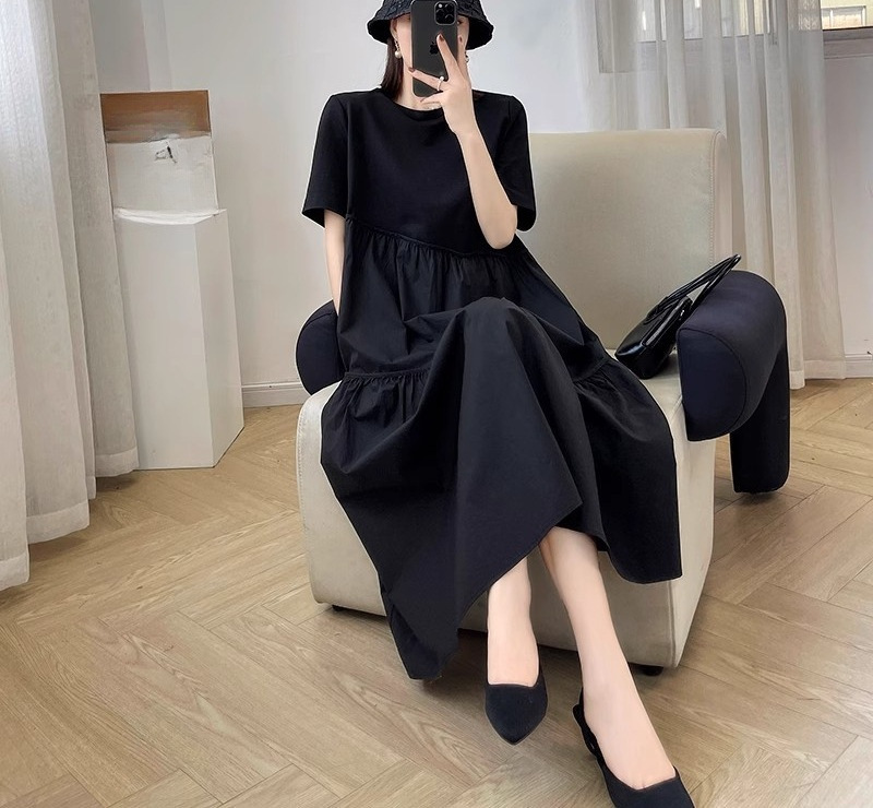 | nameOriginal | Black Short-sleeved Hepburn Style dress Women's Summer 2024 New Korean Style Loose Slimming plus size Mid-length Skirt |