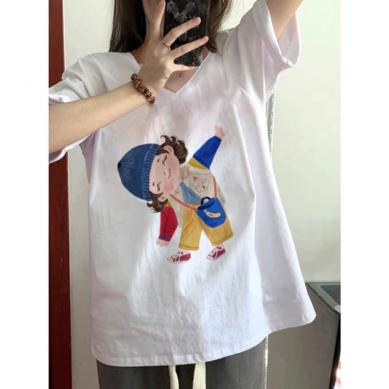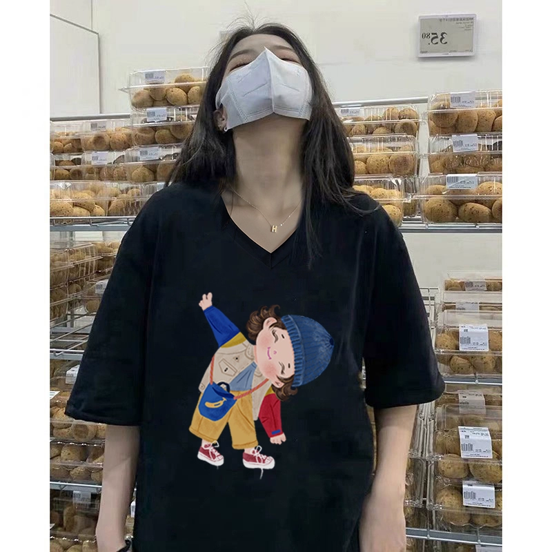 | nameOriginal | Black short-sleeved T-shirt for women in summer v-neck pure cotton printed half-sleeved Korean style loose top for women trendy plus size fat mm looks slim |