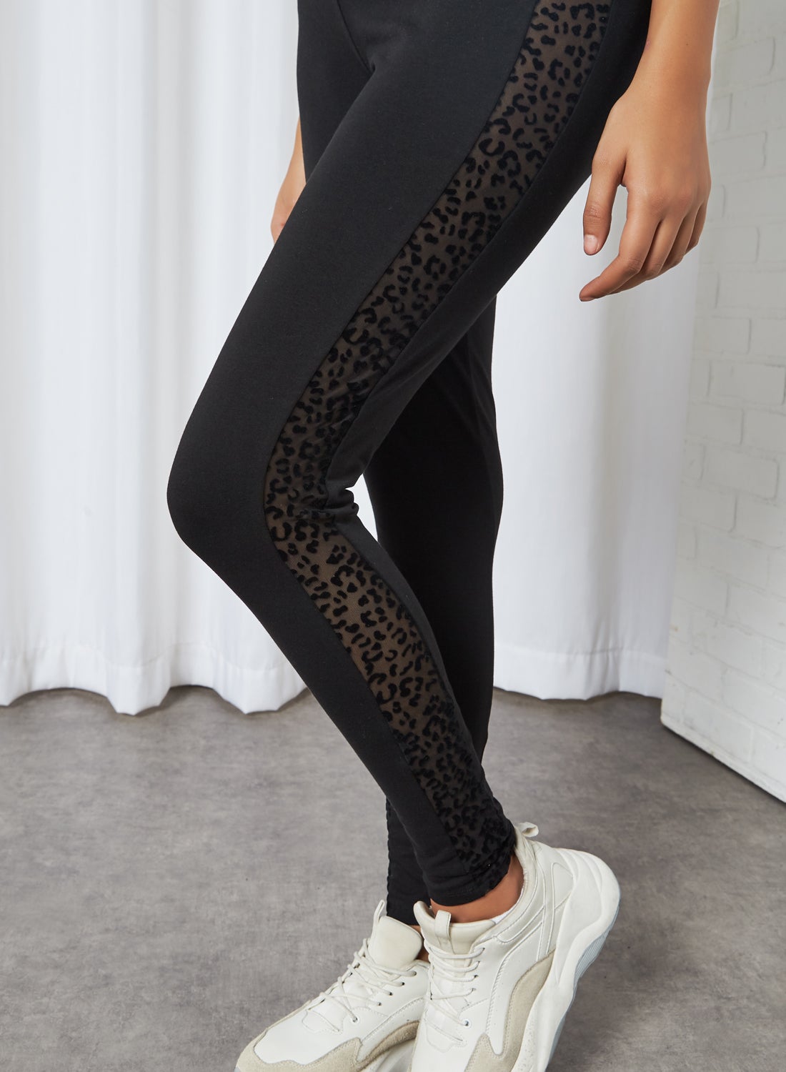 This product features a leopard print design located at the side seam, combined with a solid color for a stylish look. The material is made of a comfortable and stretchy quality, ensuring a comfortable fit.