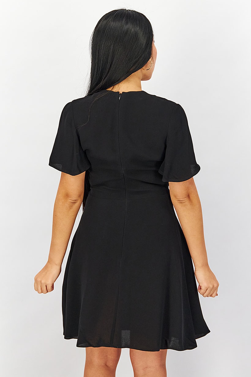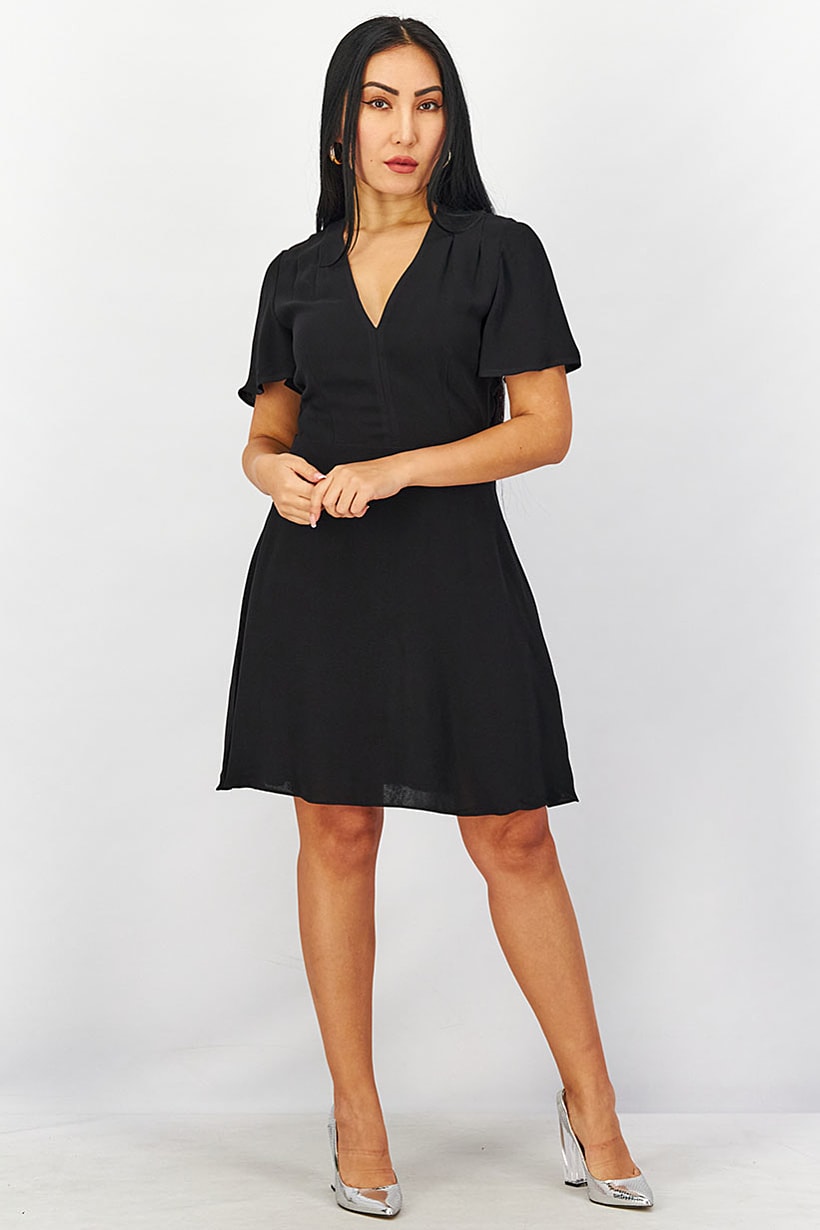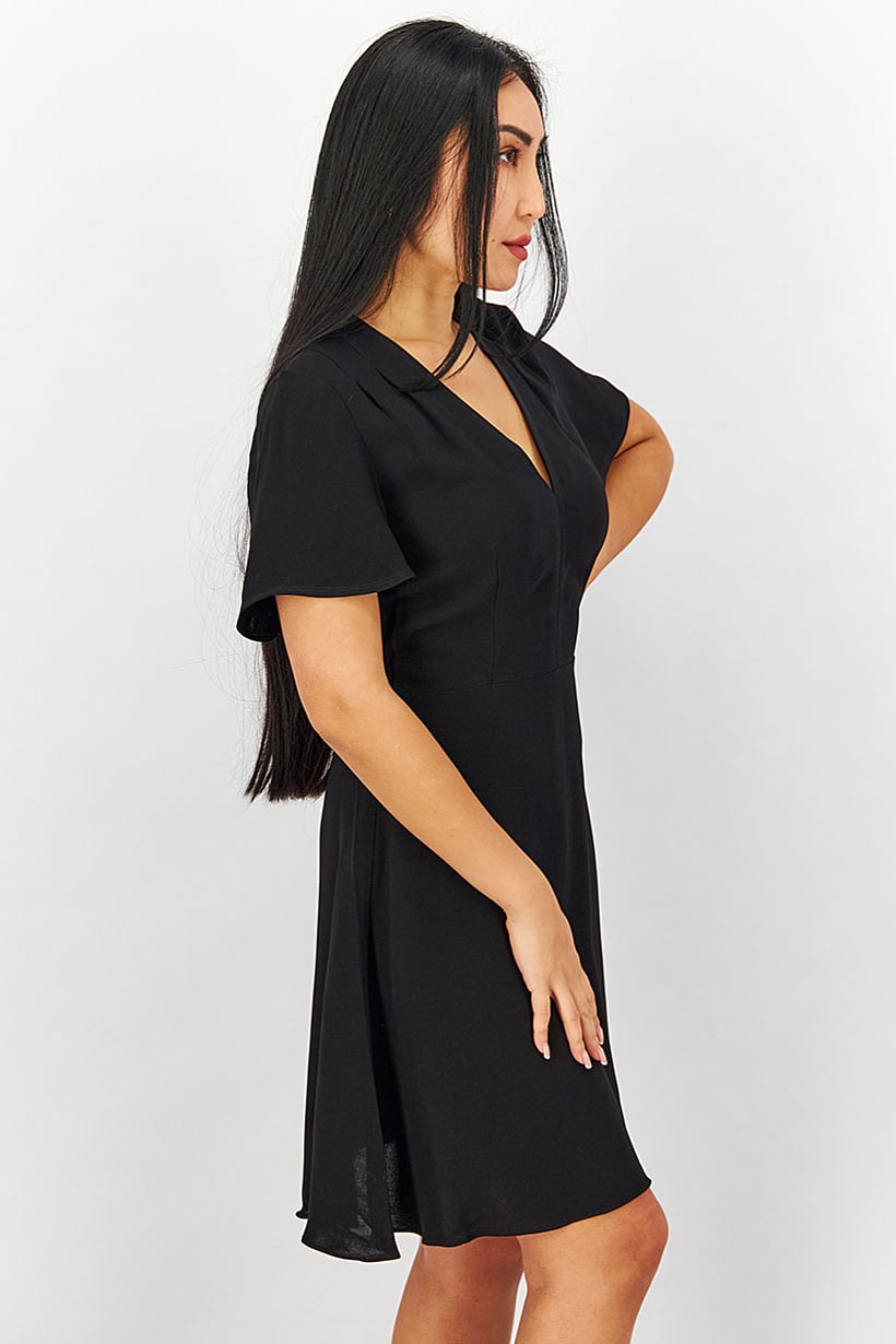 | descriptionOriginal | Care : Dry clean, Dress Style : Mini, Fit : Regular fit, Size shown : US, Types of Hem : Straight hem, Types of Neckline & Collar : V-neckline, Types of Sleeve : Sleeveless, Fabrics : 100% Viscose, Occasion : Casual, Pattern & Print : Plain/Solid, Types of Closures : Concealed zipper, Color Family : Black, |