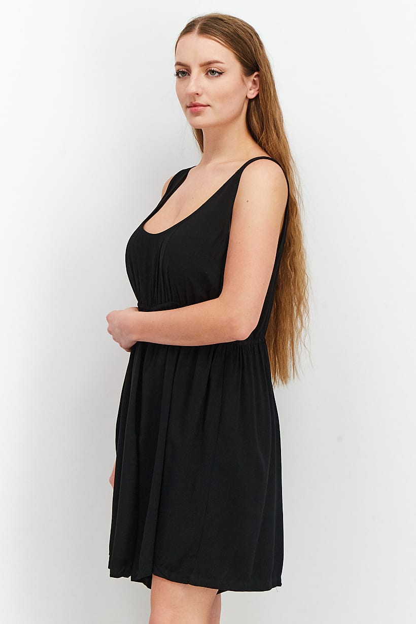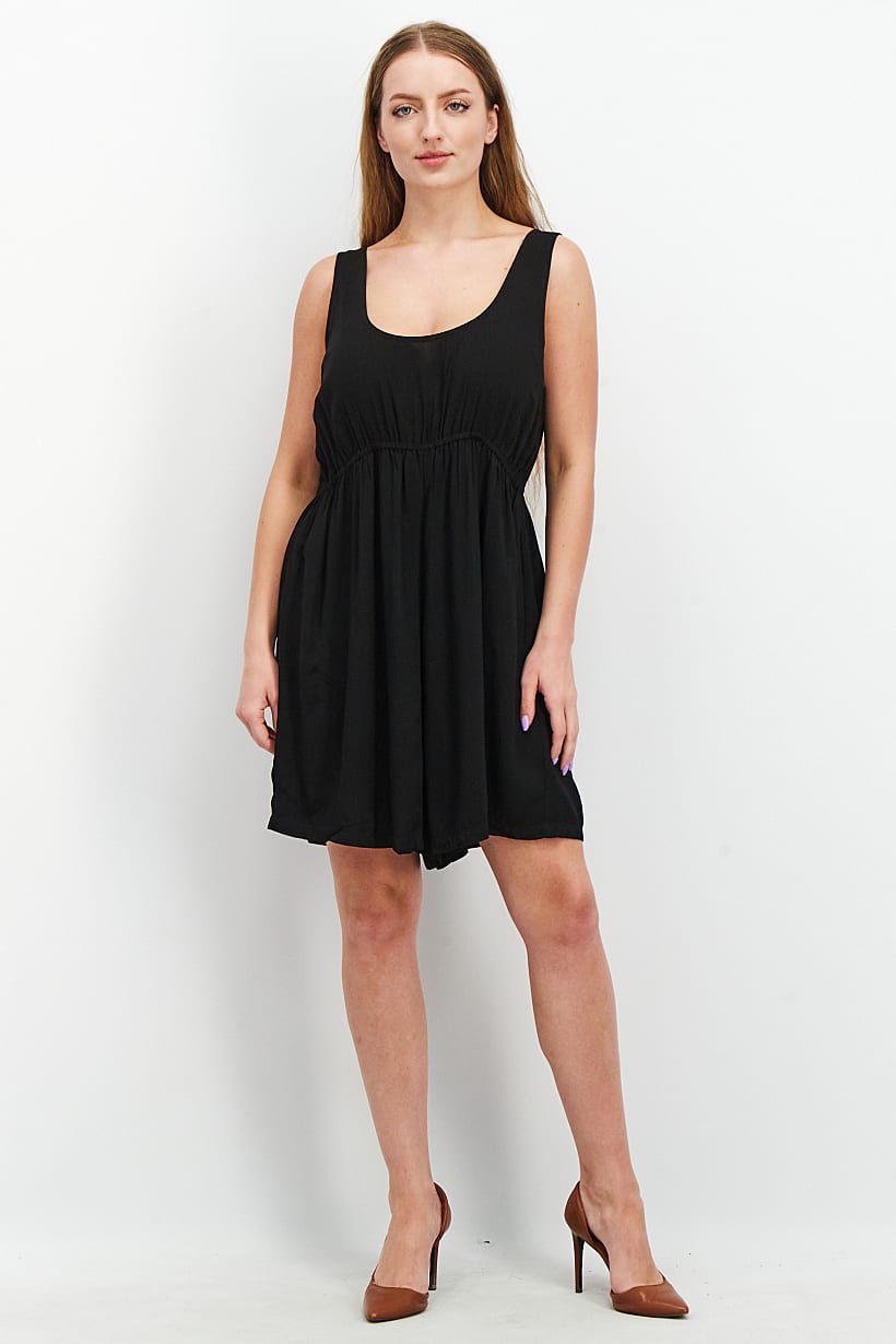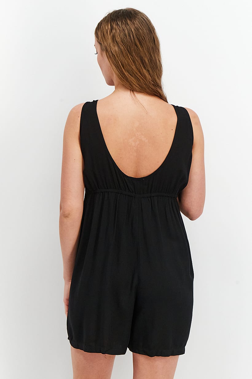 Care : Machine washable, Fit : Regular fit, Jumpsuit Type : Playsuits, Size shown : US, Types of Neckline & Collar : Scoop neckline, Types of Sleeve : Sleeveless, Disclaimer : Product color may slightly vary due to photographic lighting sources or your monitor settings., Fabrics : 100% Viscose, Occasion : Casual, Pattern & Print : Plain/Solid, Types of Closures : Pull on, Color Family : Black,