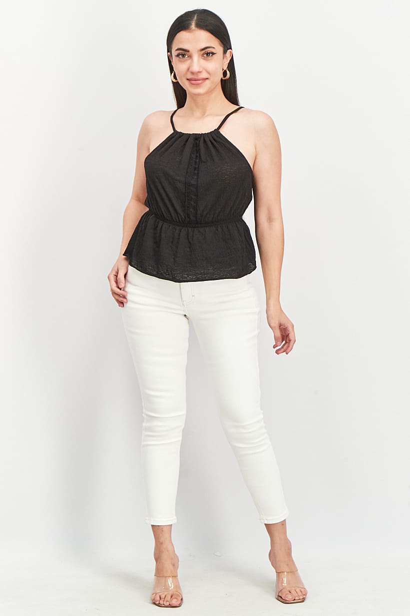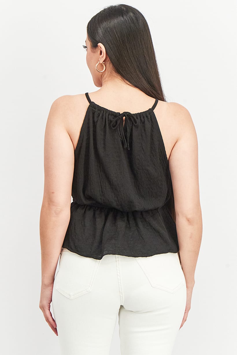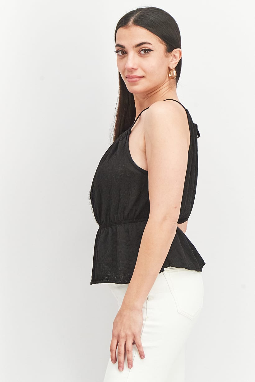 Black Sleeveless Textured Top with U-Neckline for Women.