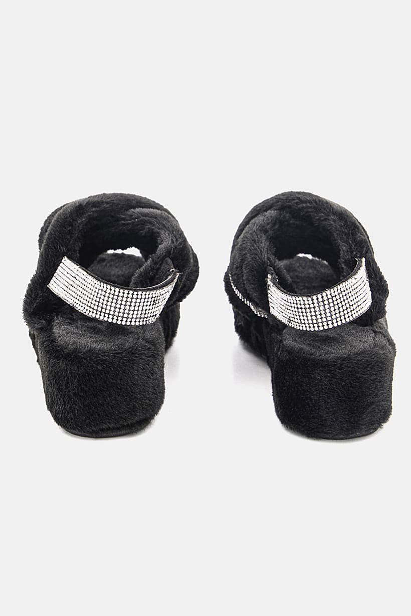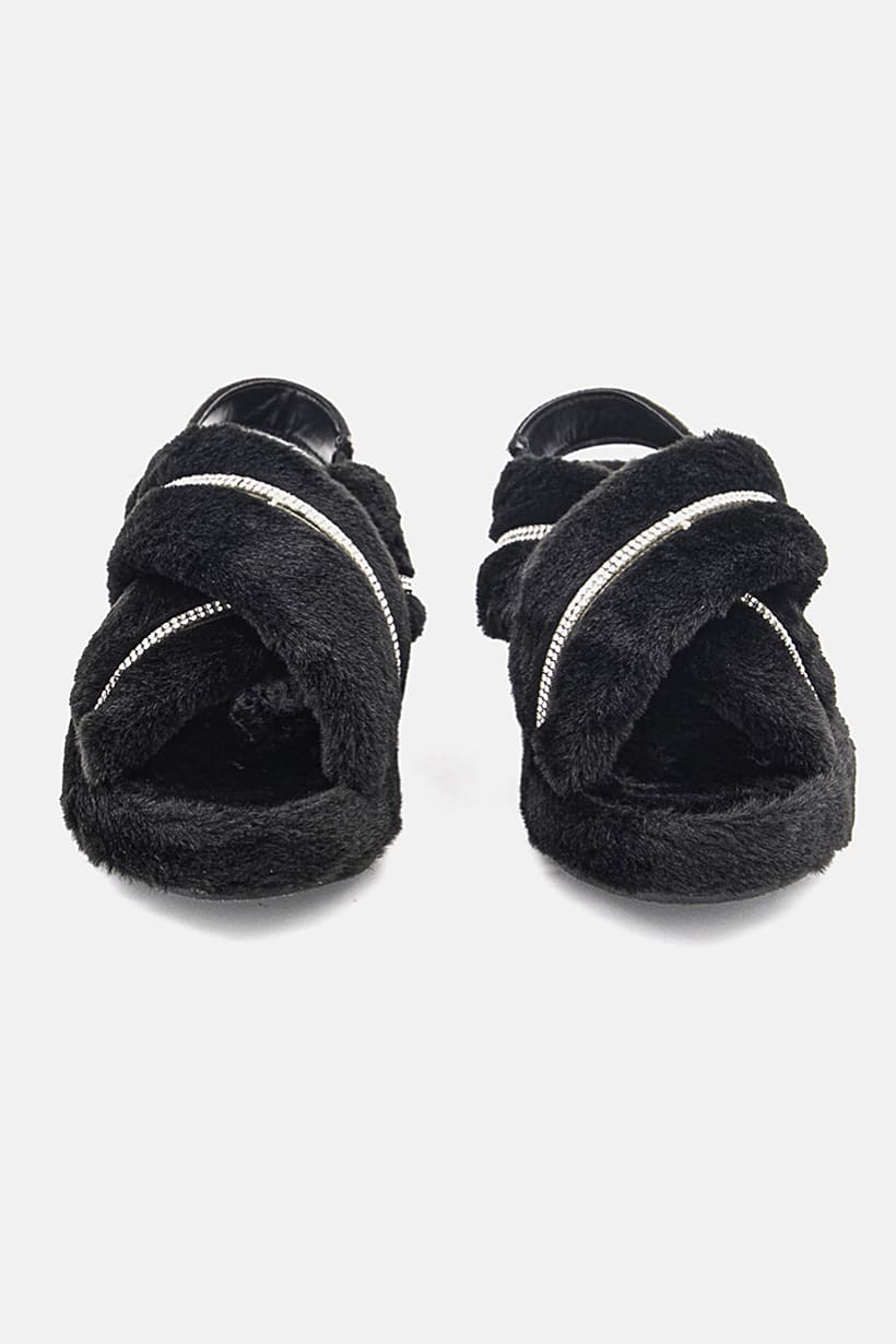 Heel Height : 1.75" / 4.5 cm, Heel Style : No heel, Ideal For : Women, Shoe Closure : Slip on, Sole Material : Rubber sole, Toe Style : Open toe, Disclaimer : Product color may slightly vary due to photographic lighting sources or your monitor settings., Embellished : Beads, Occasion : Casual, Pattern & Print : Textured pattern, Shoe Material : Faux fur, Color Family : Black, Disclaimer : Box not included,