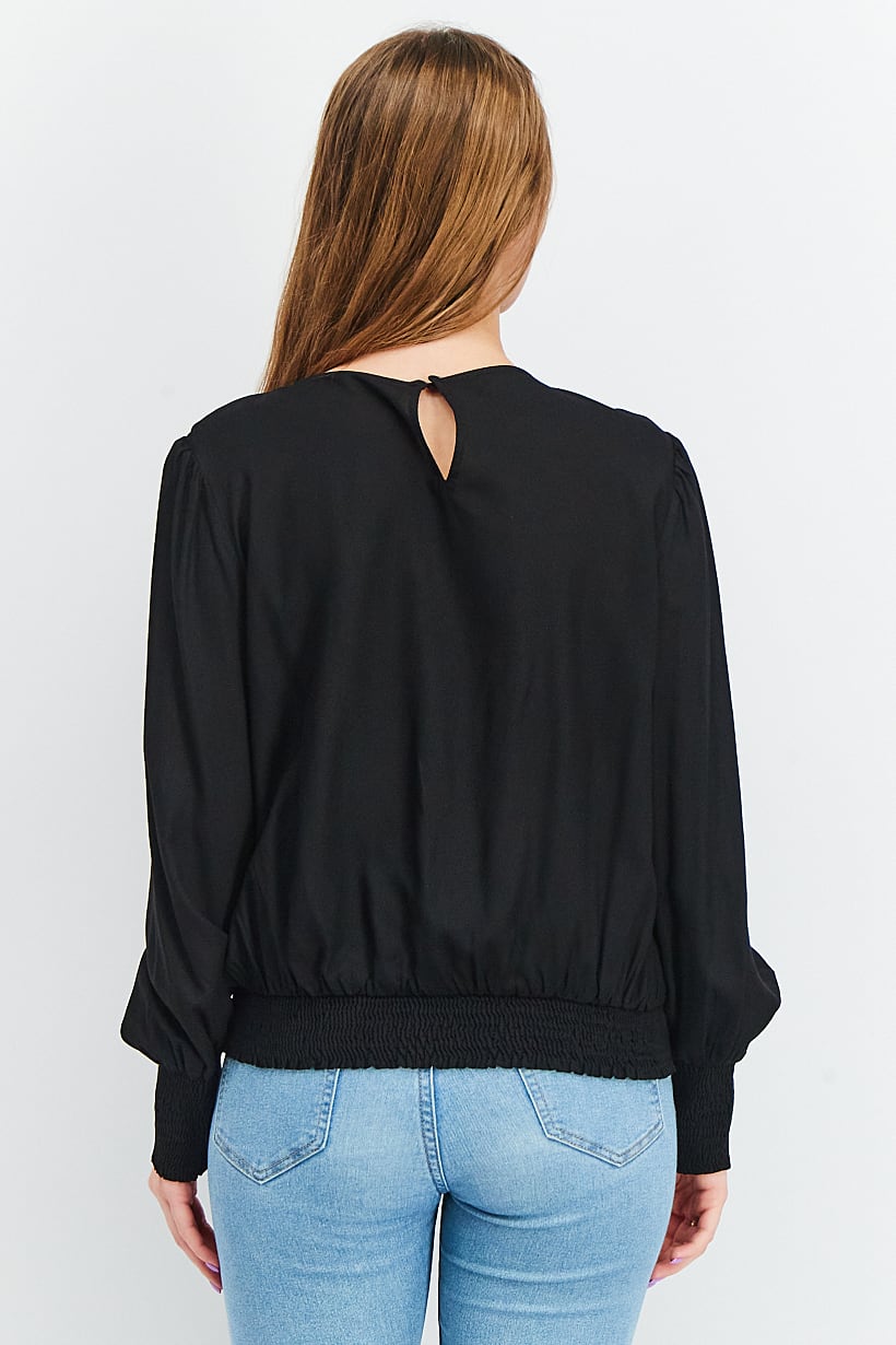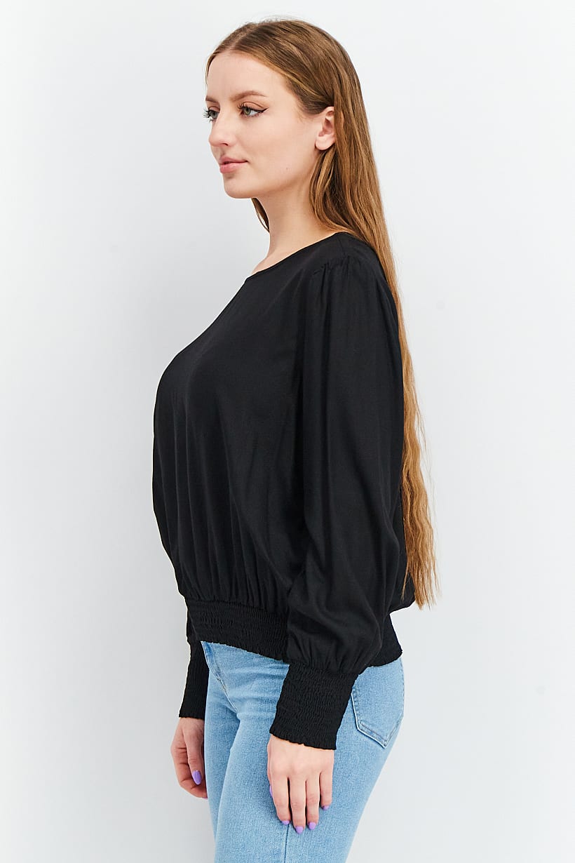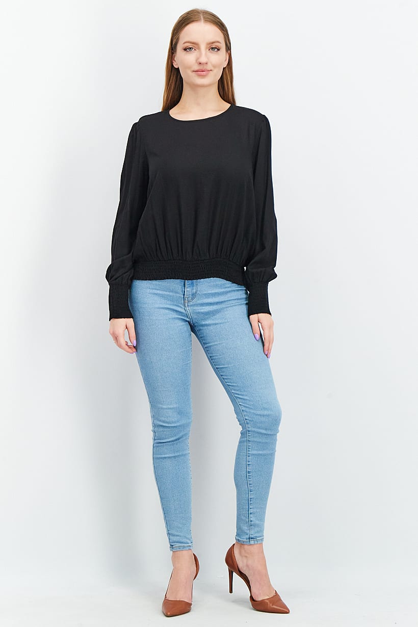 This blouse is designed for a regular fit and is machine washable for easy care. It features a crew neckline and long sleeves with an elasticized hem. The fabric is made of 100% viscose and comes in a solid black color. Please note that the product color may vary slightly due to lighting or monitor settings. This blouse is perfect for casual occasions and can be easily pulled over with no closures.