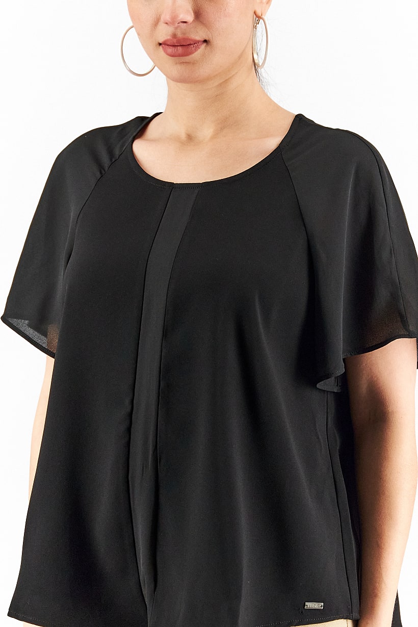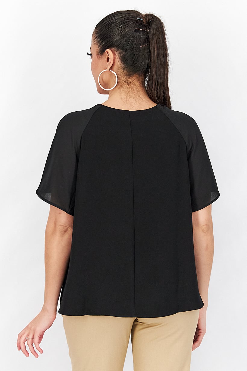 | descriptionOriginal | Care : Machine washable, Fit : Regular fit, Ideal For : Women, Size shown : US, Types of Hem : Straight hem, Types of Neckline & Collar : U-neckline, Types of Sleeve : Sheer sleeve, Disclaimer : Product color may slightly vary due to photographic lighting sources or your monitor settings., Fabrics : 100% Polyester, Occasion : Casual, Pattern & Print : Plain/Solid, Types of Closures : Pullover, Color Family : Black, |