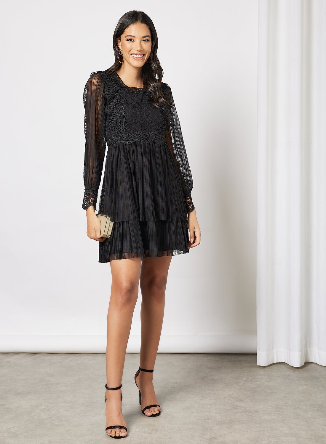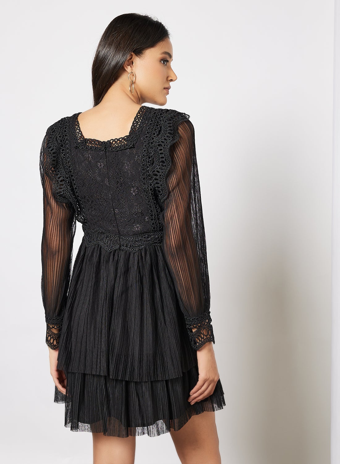This product features a cozy and textured polyester fabric that provides comfort. It has a square neckline and long sleeves, with a lace detail on the front. The back has a concealed zipper closure, and the product has a regular fit with a mini length. Please follow the care label instructions when washing.
