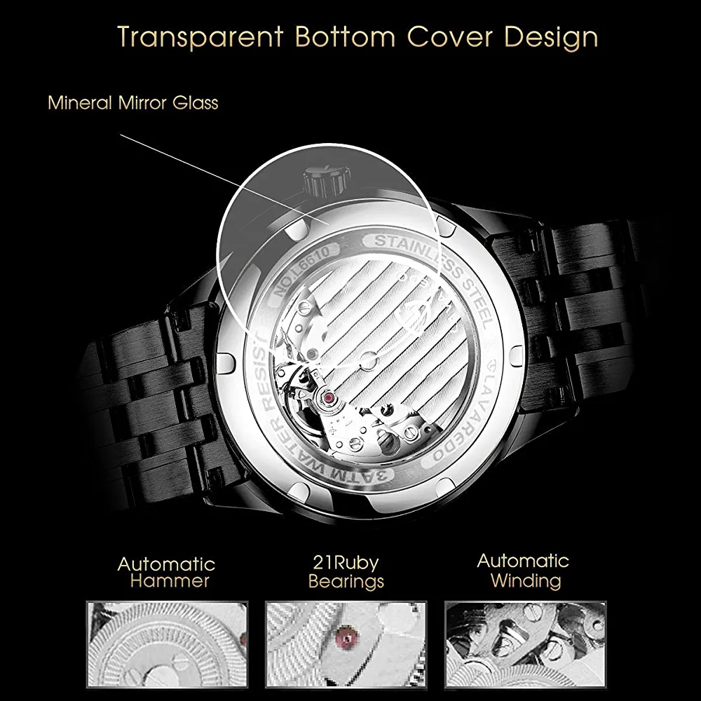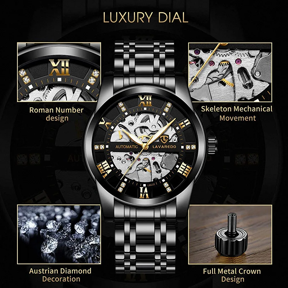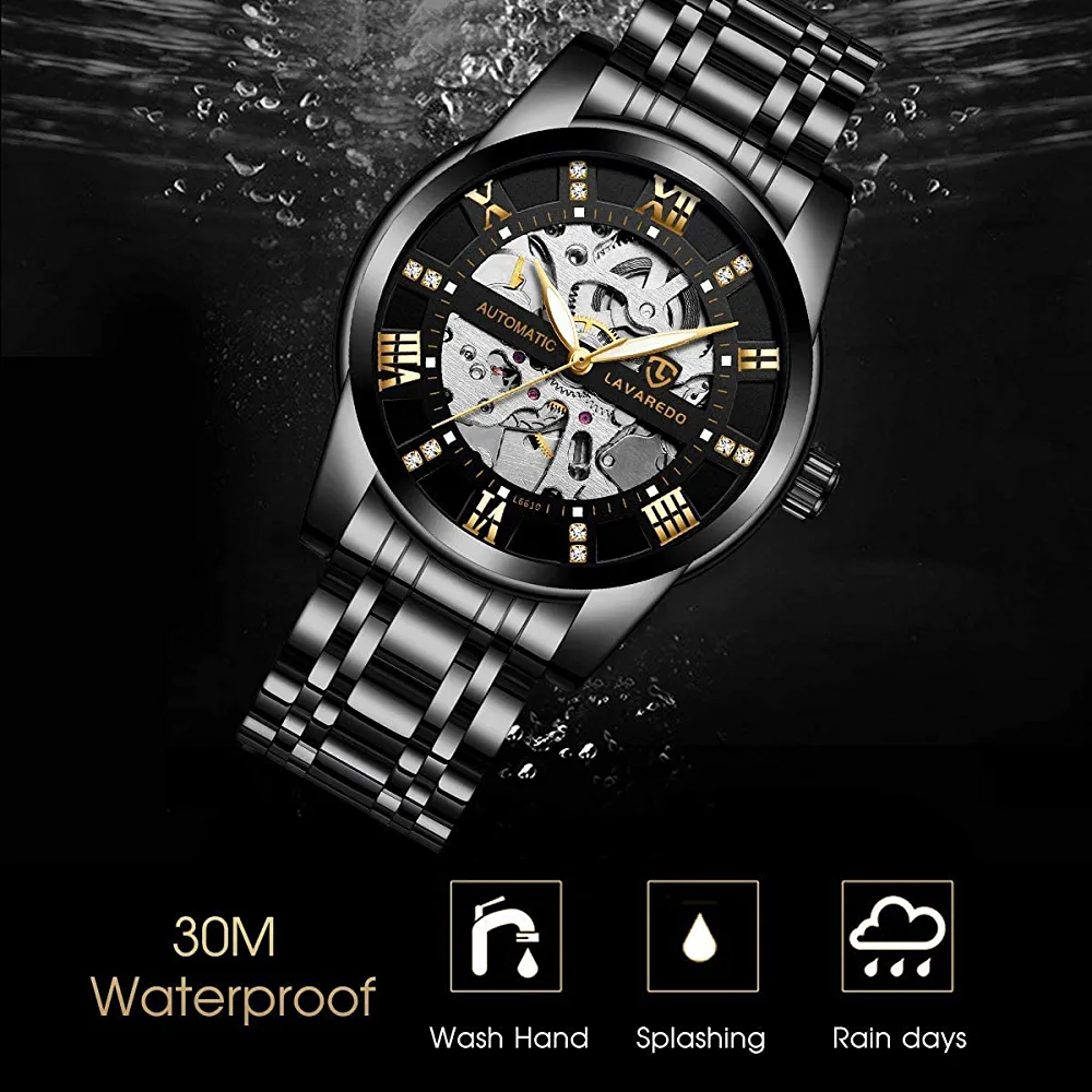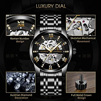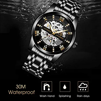 Whether you’re dressing up for a formal event or simply running errands, the Men’s Watch Black Mechanical Stainless Steel Skeleton Waterproof Automatic Self-Winding Roman Numerals Diamond Dial Wrist Watch is the perfect accessory to complete your look.
