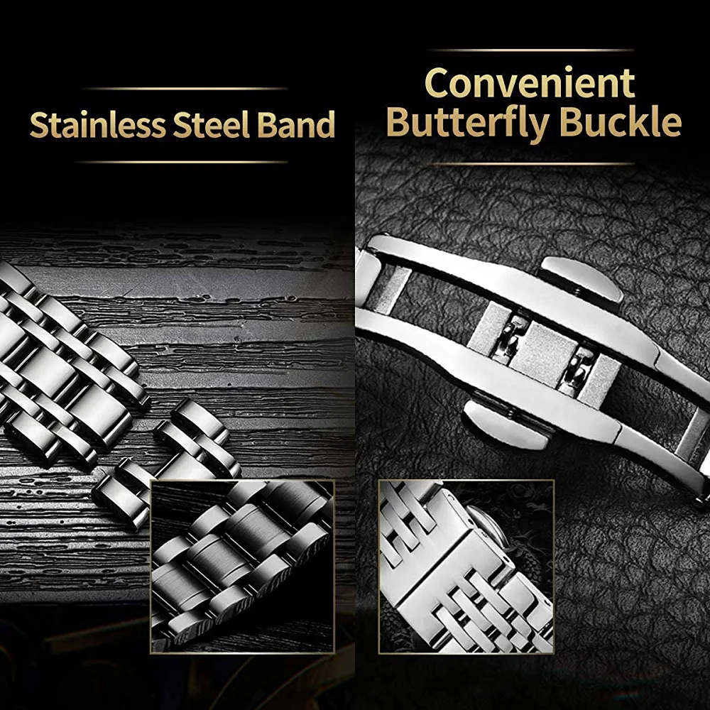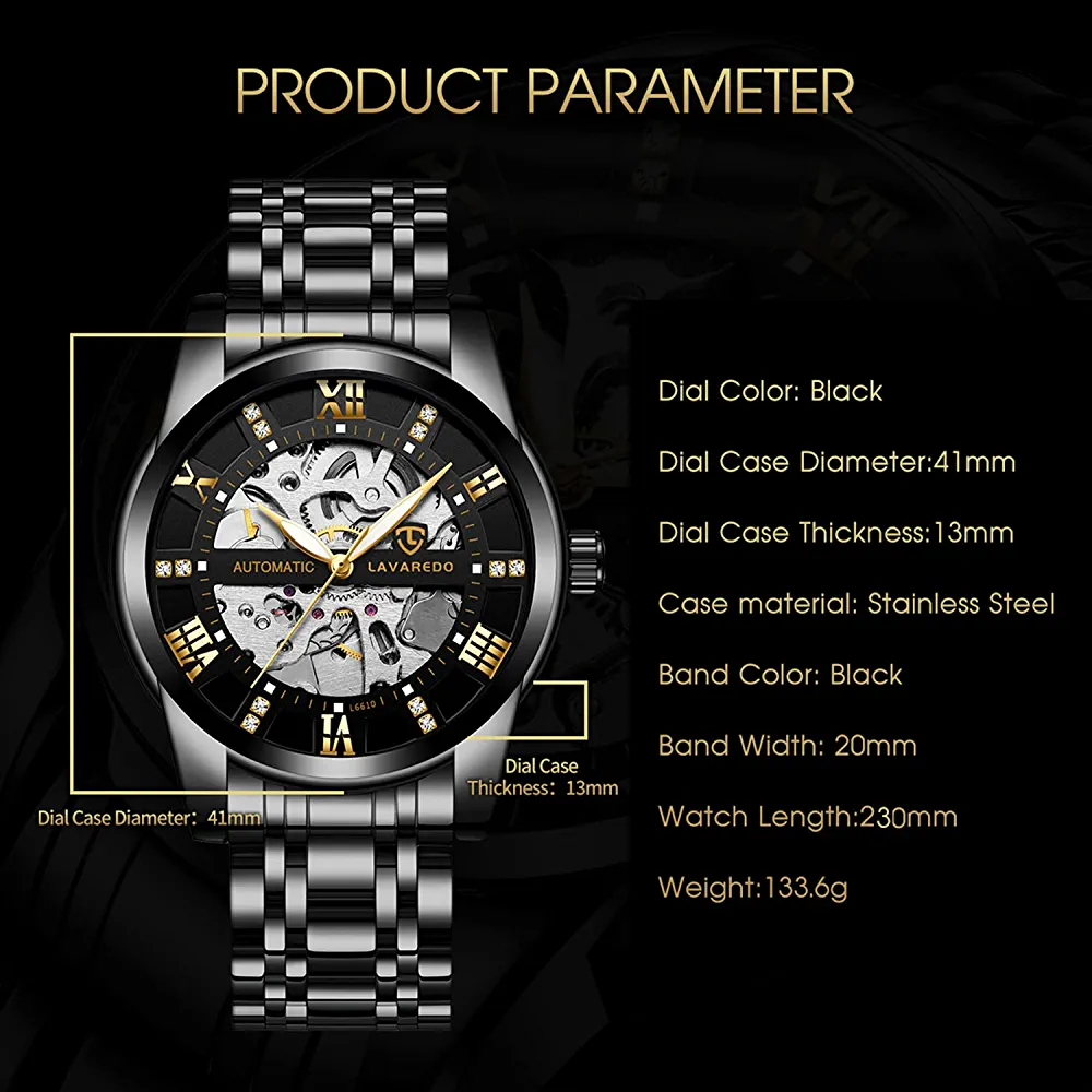 Introducing the Men’s Watch Black Mechanical Stainless Steel Skeleton Waterproof Automatic Self-Winding Roman Numerals Diamond Dial Wrist Watch – the perfect combination of style and functionality. This watch features a sleek black stainless steel band and a stunning diamond dial with Roman numerals, making it a timeless piece that will elevate any outfit.
