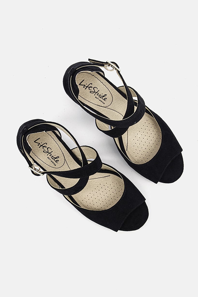 Heel Height : 3" / 7.6 cm, Heel Style : Block heel, Ideal For : Women, Shoe Closure : Adjustable buckle closure, Shoe Width : Wide, Sole Material : Synthetic sole, Toe Style : Open toe, Disclaimer : Product color may slightly vary due to photographic lighting sources or your monitor settings., Occasion : Casual, Pattern & Print : Textured pattern, Shoe Material : Micro Suede, Color Family : Black,
