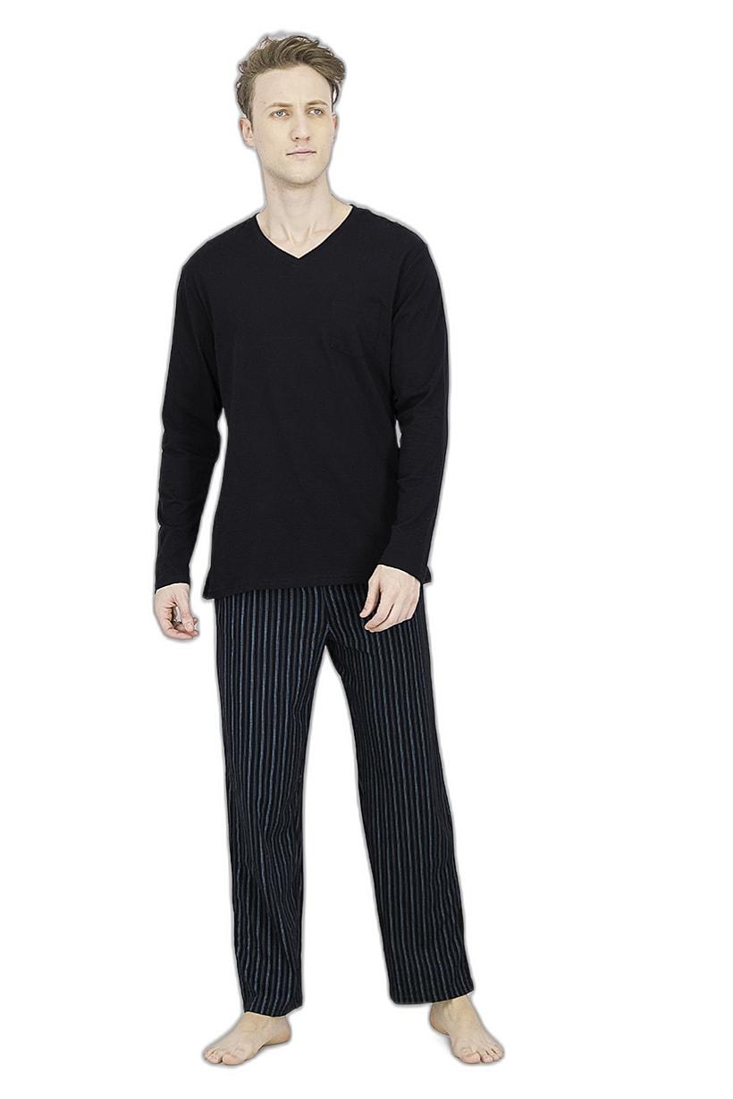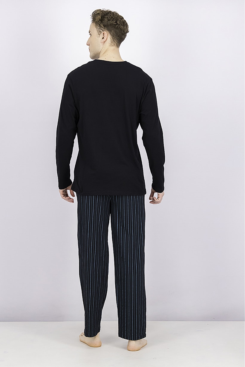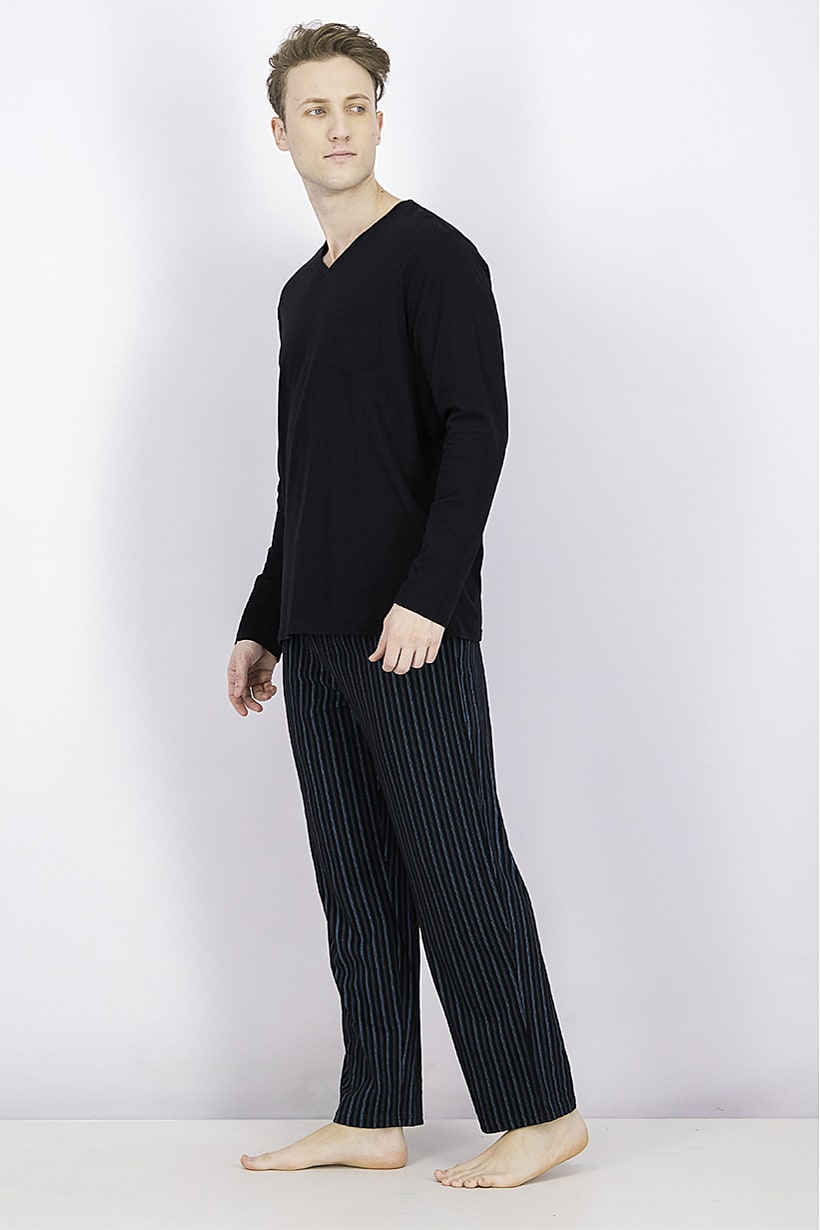 This product is suitable for men and can be easily washed in a machine. It is a set of pyjamas with a long-sleeved top and a straight hem. The neckline is a V-shape and the collar is simple. The elastic waistband ensures a comfortable fit. Made from 100% cotton, the product comes in a plain/solid or stripe pattern. The sleeves are also long and the closure is a pullover style. The color of the product is black.