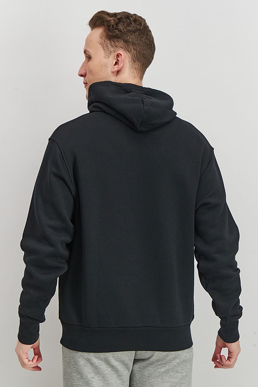 This product is machine washable and has a sportswear fit. The size shown is international and it has long sleeves with a medium thickness. The neckline and collar are a hood with drawstrings, making it suitable for training. Please note that the product color may slightly vary due to photographic lighting sources or monitor settings. The fabric is made of 95% cotton and 5% elastane, with a brand logo pattern and print. This is a pullover hoodie in the color family of black.