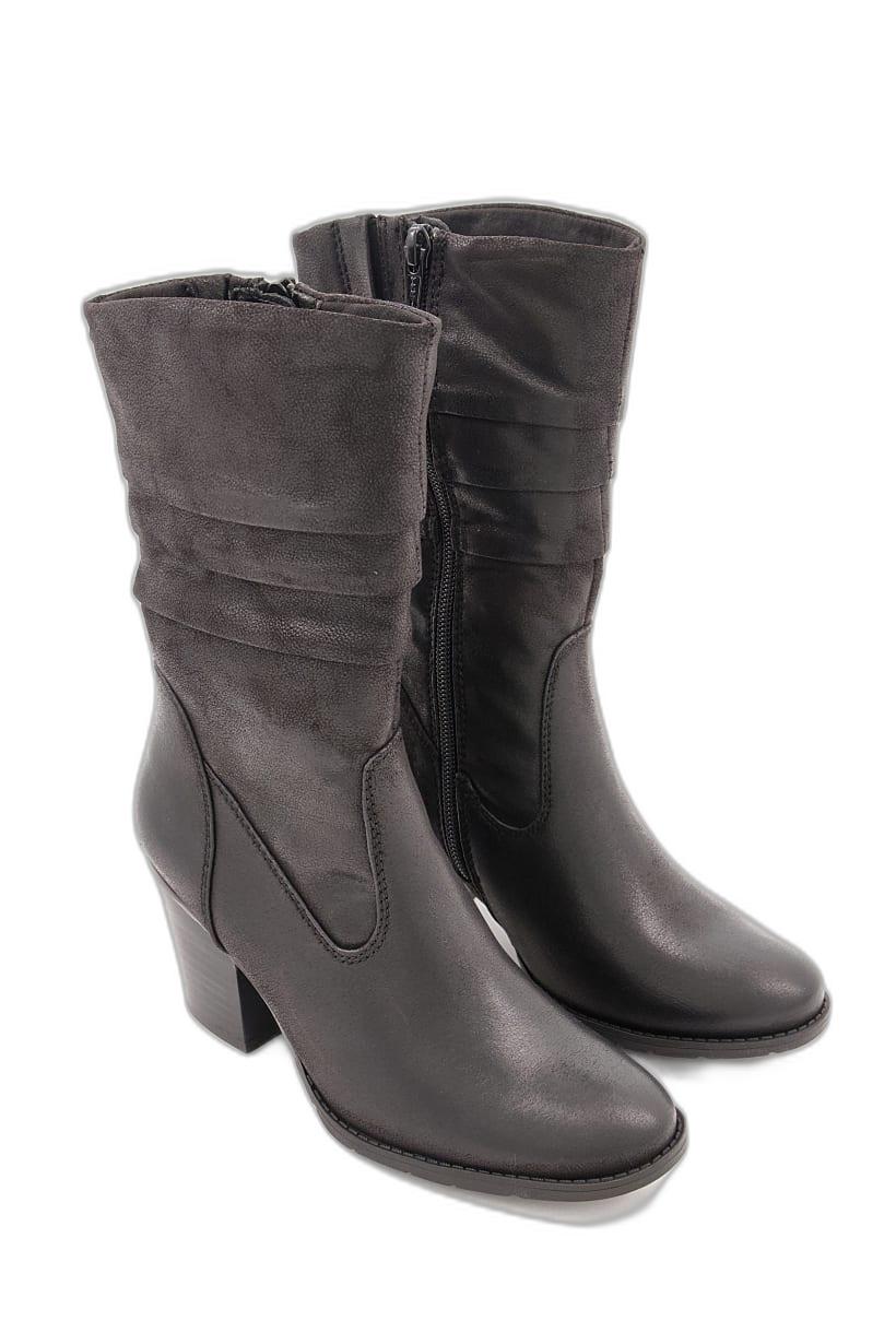 Heel Height : 3" / 7.6 cm, Heel Style : Block heel, Ideal For : Women, Insole Features : Lightly padded insole, Shoe Closure : Zipper closure, Shoe Width : Medium, Sole Material : TPR sole, Style : Mid Calf Boot, Toe Style : Closed toe, Disclaimer : Product color may slightly vary due to photographic lighting sources or your monitor settings., Occasion : Casual, Pattern & Print : Textured pattern, Shoe Material : Textile, Color Family : Black,