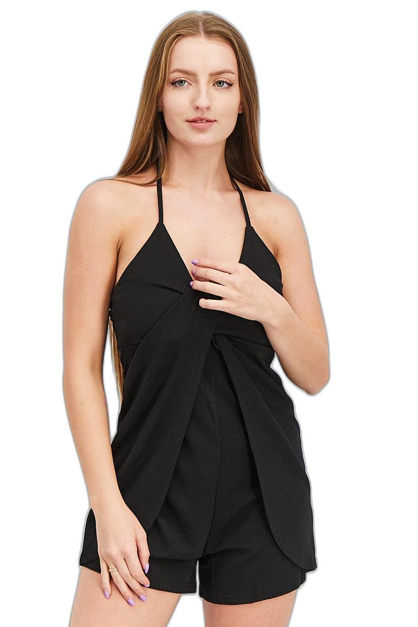 Black Textured Playsuit with Tie Neck Overlay for Women.