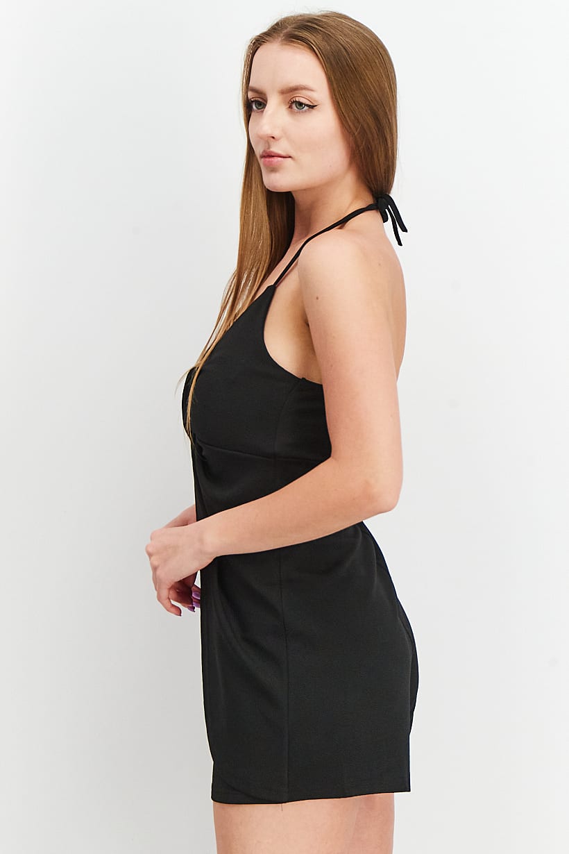 Care : Hand wash, Fit : Regular fit, Jumpsuit Type : Playsuits, Size shown : UK, Types of Neckline & Collar : Tie neckline, Types of Sleeve : Sleeveless, Fabrics : 75% Polyester, 25% Elastane, Occasion : Casual, Pattern & Print : Textured pattern, Types of Closures : Pull on, Color Family : Black,