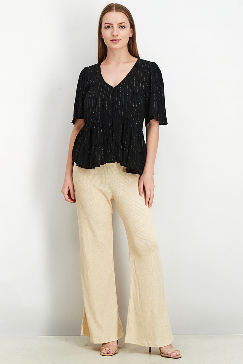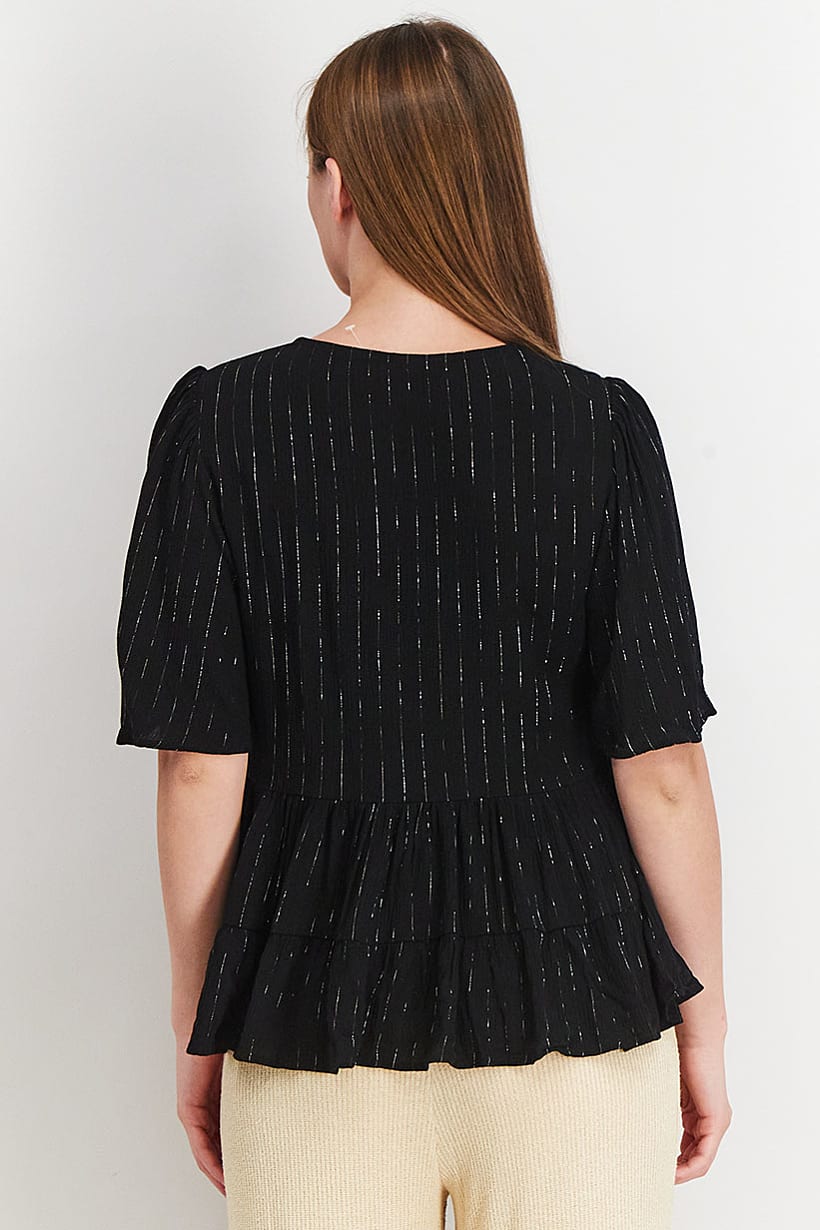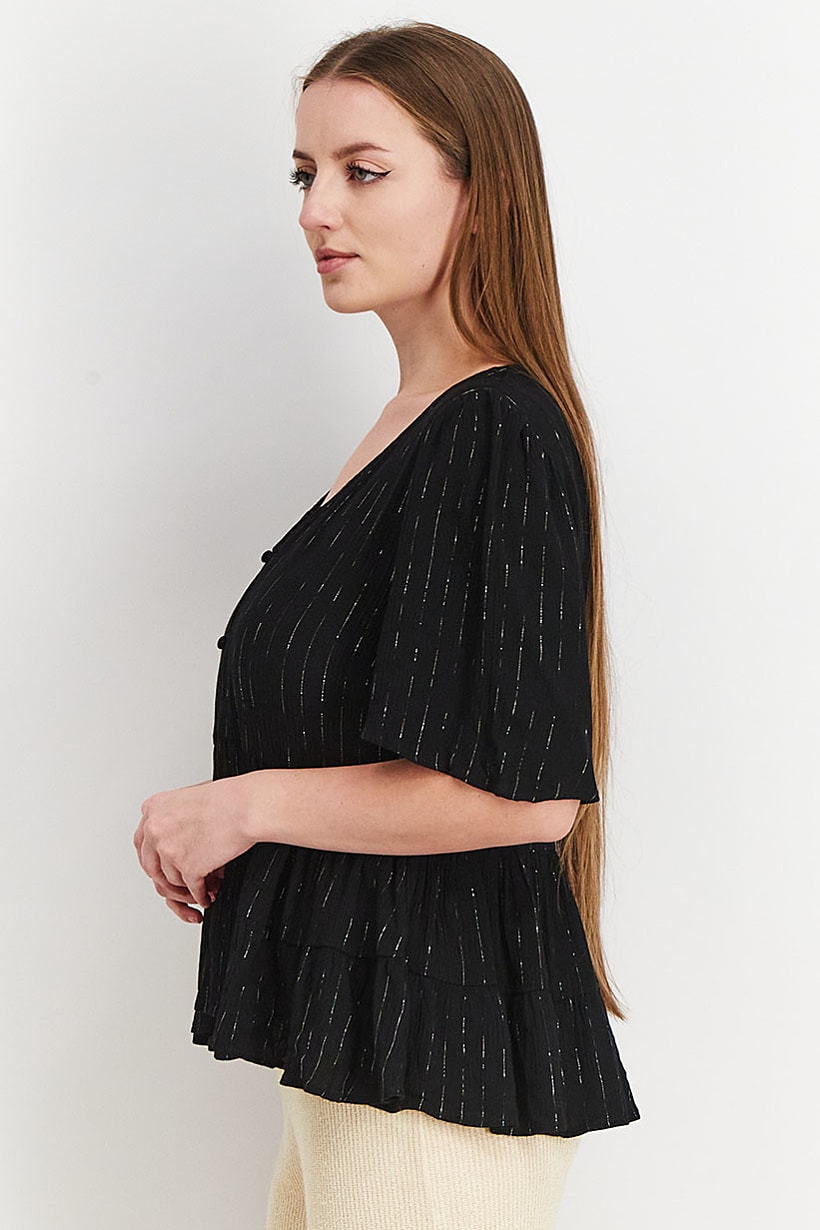| descriptionOriginal | Care : Machine washable, Fit : Regular fit, Ideal For : Women, Size shown : US, Top Style : Blouse, Types of Hem : Ruffle hem, Types of Neckline & Collar : V-neckline, Types of Sleeve : Short sleeve, Disclaimer : Product color may slightly vary due to photographic lighting sources or your monitor settings., Fabrics : 100% Viscose, Occasion : Casual, Pattern & Print : Textured pattern, Types of Closures : Pullover, Color Family : Black, |